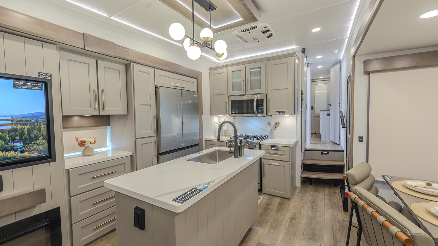 The Alliance RV Paradigm 295MK fifth wheel is designed for those who appreciate luxury, comfort, and convenience, all while embracing the great outdoors. The standout feature of this model is its middle kitchen, an ideal setup for the cook in the family. Equipped with an Insignia range featuring a 12,000 BTU burner, a 3.73 cu. ft. oven, and a residential microwave, this kitchen is as functional as it is stylish. The kitchen island with prep space and dishwasher prep option makes meal prep a breeze, so you can spend less time cooking and more time enjoying your adventure.