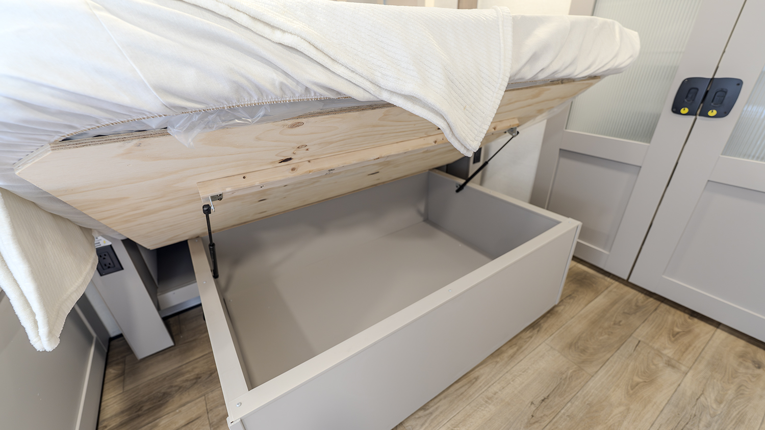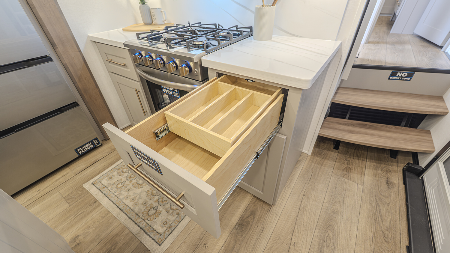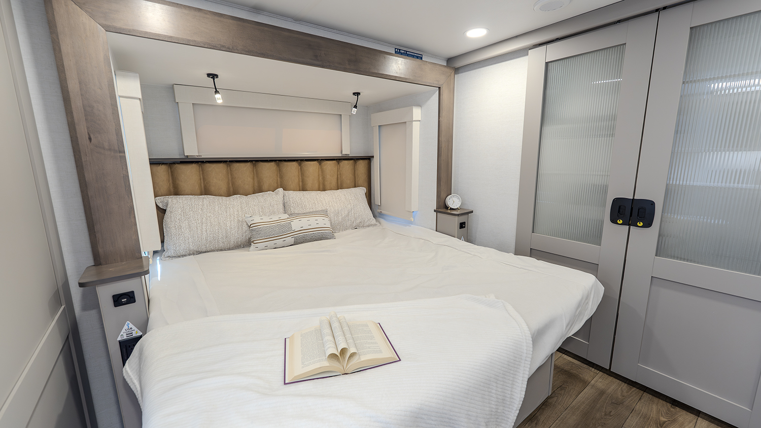 The front bedroom provides a peaceful retreat with a king bed slide (with a queen option available for more floor space). You'll also enjoy thoughtful touches like a flip-top dresser, a seat with storage, and a front wardrobe prepped for a washer and dryer. The dual-entry bathroom features a residential-style shower, a porcelain toilet with a soft-close seat, and additional high-end finishes that create a spa-like experience on the road.
