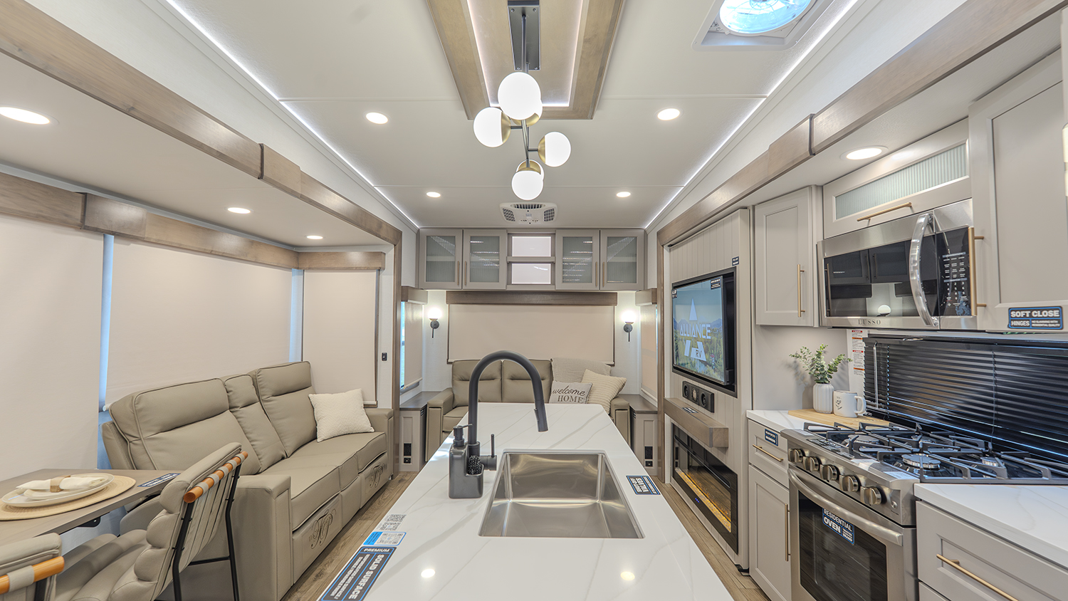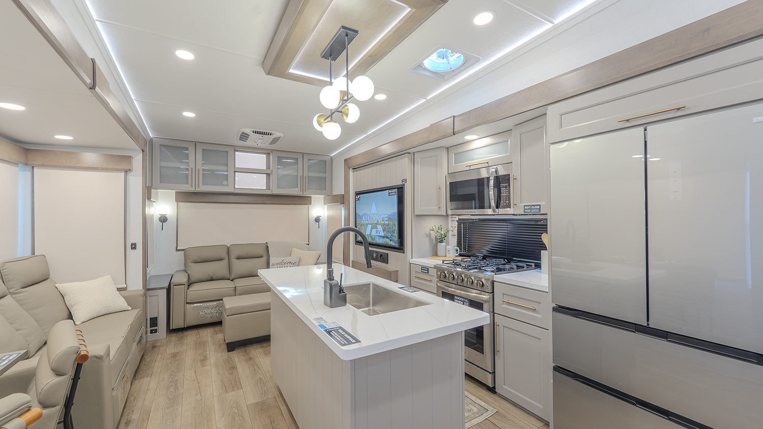 The Alliance RV Paradigm 340RL fifth wheel is designed to elevate your travel experience, whether you're visiting family and friends or exploring new destinations. This luxurious RV features a spacious rear living area with dual opposing slides, providing ample space for both comfort and entertainment. Relax on the dual recliner love seat, enjoy the warmth of the fireplace, or watch your favorite shows on the 50" Smart TV. Behind the TV, you’ll find hidden pantry storage, maximizing space while keeping your essentials within reach.