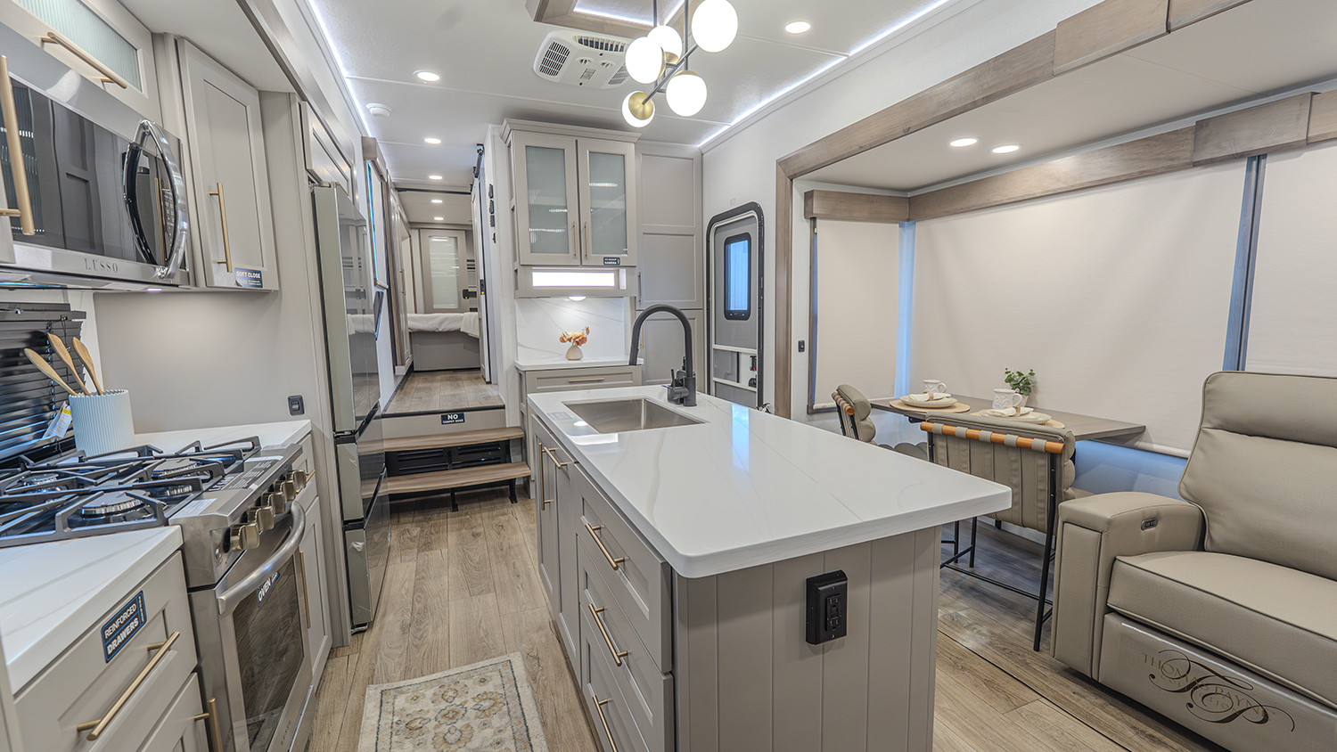 In the bedroom, you’ll enjoy a spacious retreat with a king bed and two bedroom seats for added comfort. The large bedroom closet offers generous hanging space, while the third slide-out in the hallway provides even more shelf storage, ensuring you have plenty of room for your belongings. The full bathroom includes a roomy 61" x 30" shower, offering the convenience of home even on the road.