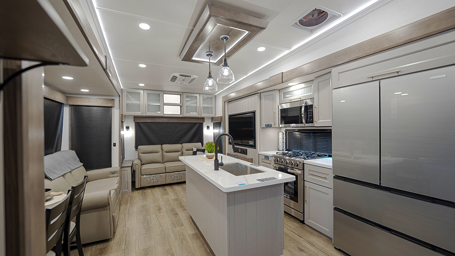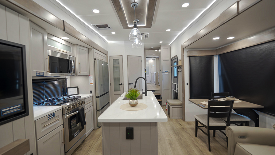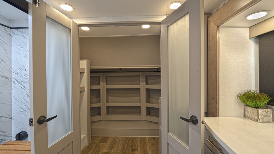 The Alliance RV Paradigm 370FB fifth wheel offers exceptional comfort and convenience for full-time living or long-term travel. Designed with luxury and functionality in mind, this model features a large front bathroom that will make you feel right at home. The 61" x 30" residential shower, ample linen storage, and a walk-in closet with a hamper, shelves, and a prep area for an optional washer/dryer will make you appreciate the extra space and thoughtful design.