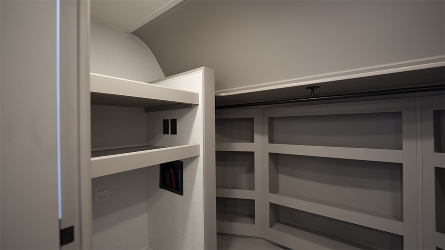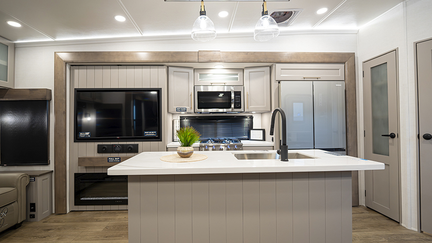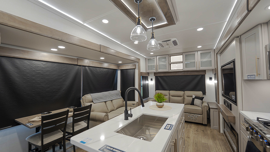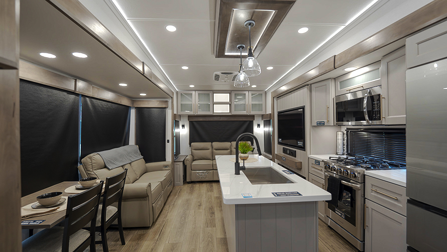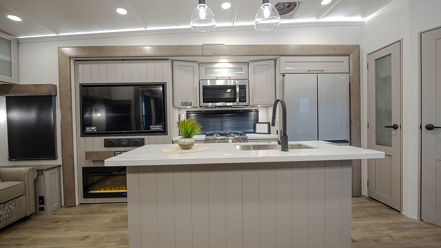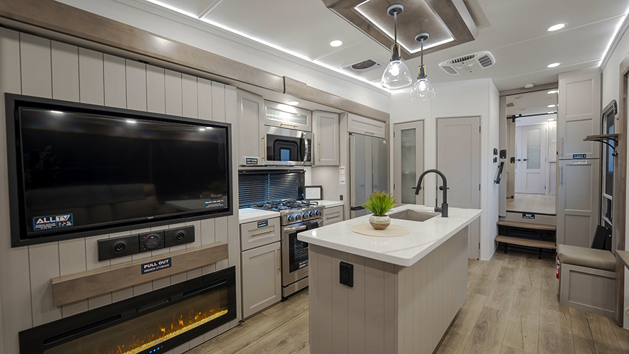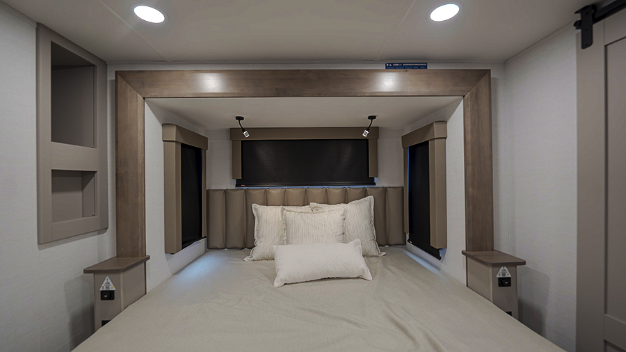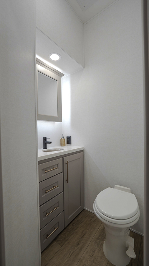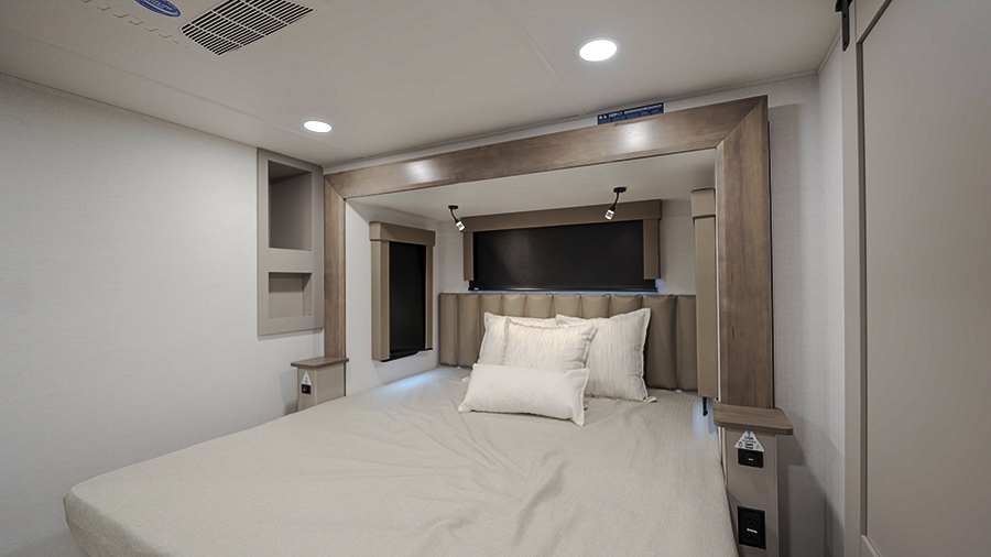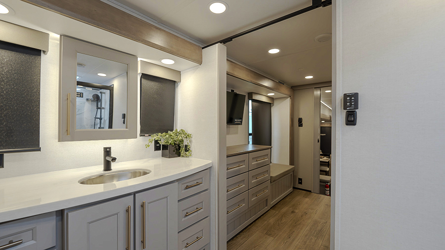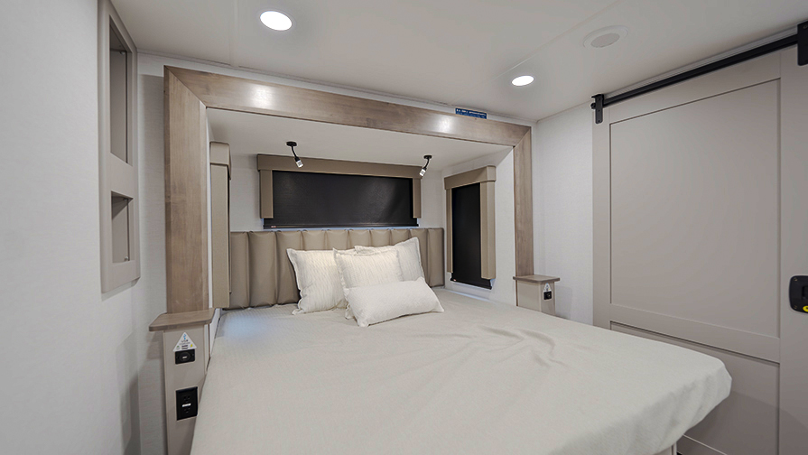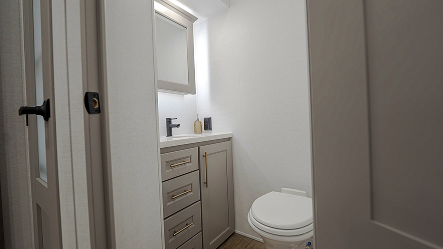 The master bedroom features two slides, giving you extra floor space and storage. Enjoy the comfort of a king-sized bed, and store your belongings in the flip-top dresser and under-seat storage. You can unwind while watching the Smart TV or simply relax in style with the space-saving sliding doors that add elegance to the room.