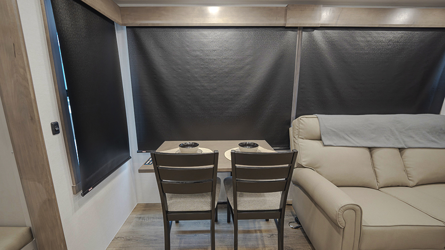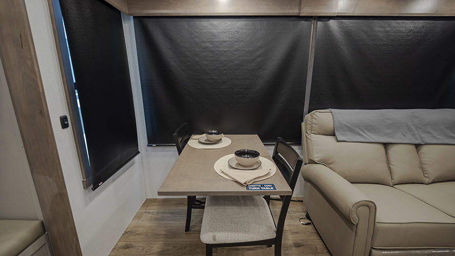 Relax in the rear living area, where you'll find a dual recliner love seat, sleeper sofa, and a swivel table and desk, providing versatile options for dining, working, or unwinding after a day of travel.