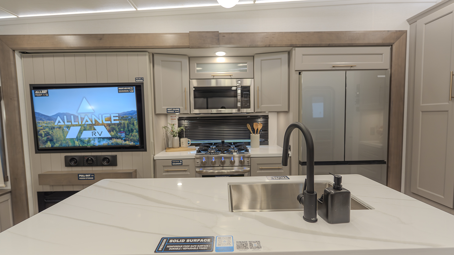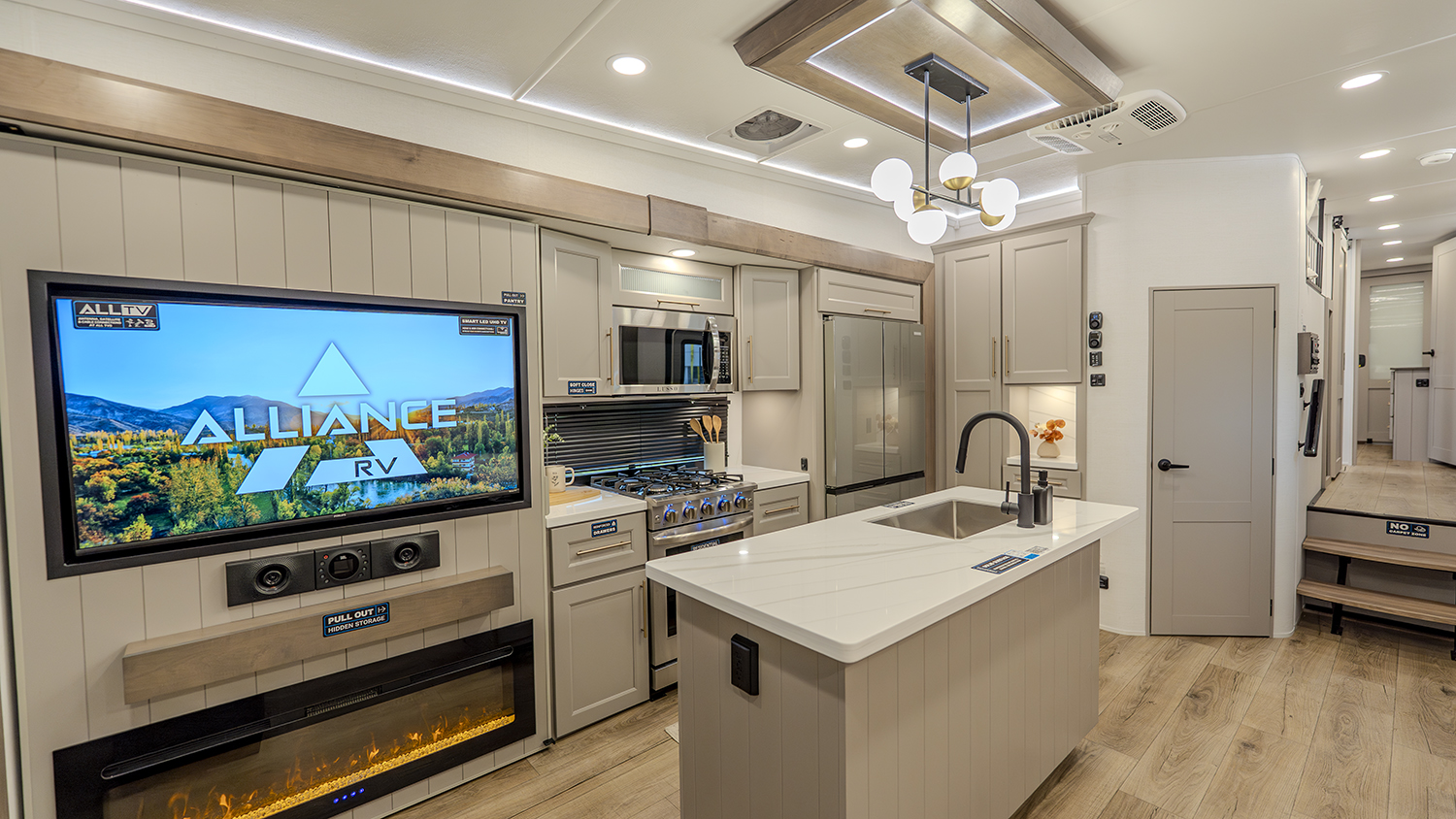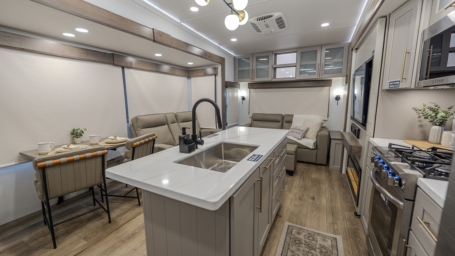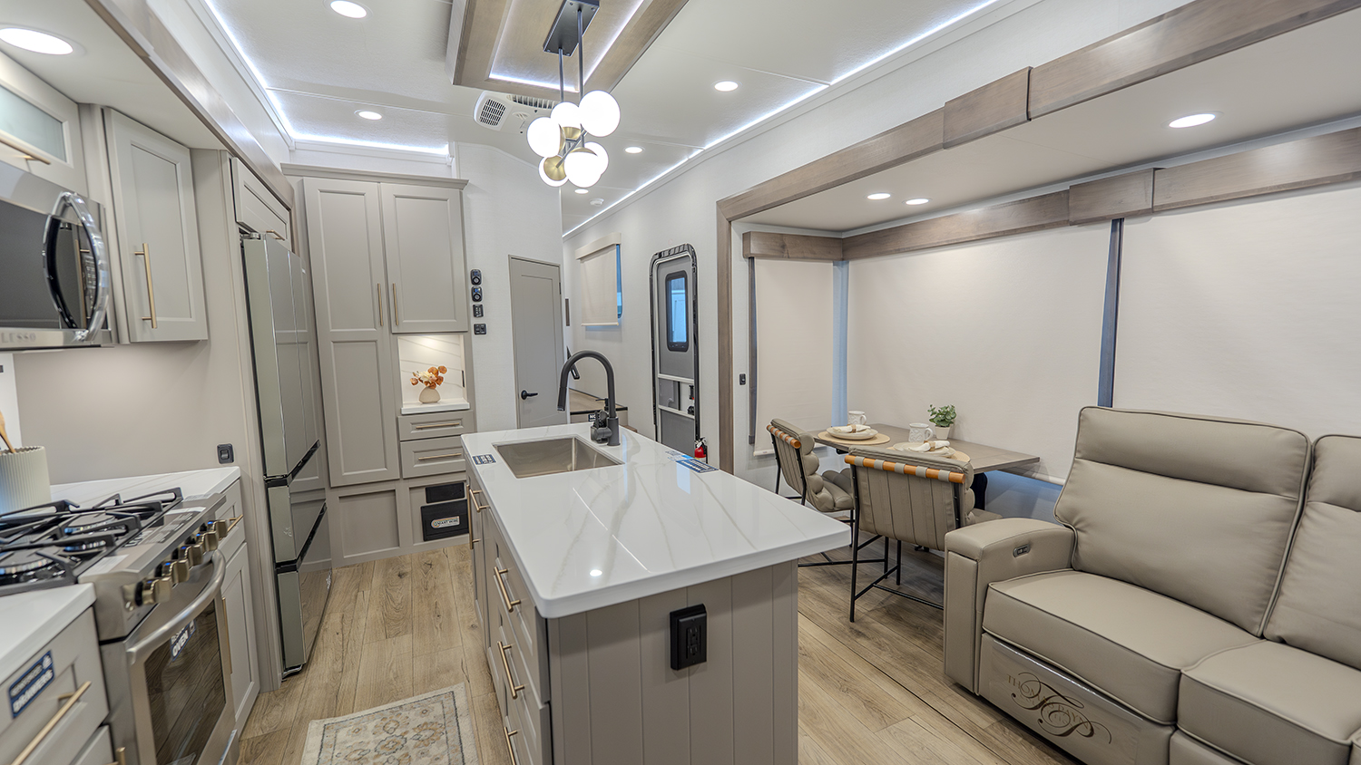 The main living and kitchen area is perfect for cooking, entertaining, and relaxing. It features residential appliances, including a kitchen island with dishwasher prep and a large sink. You’ll also find a pantry for snacks and hidden pantry storage behind the TV for extra convenience. The rear living area includes a dual recliner loveseat and a sleeper sofa along the back wall, offering plenty of seating for relaxation or socializing.