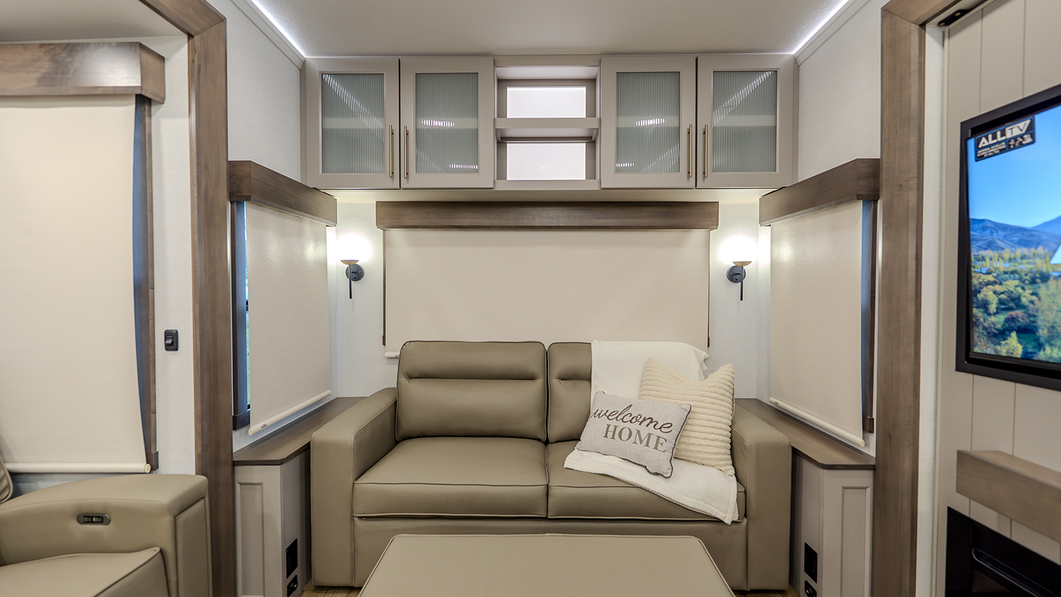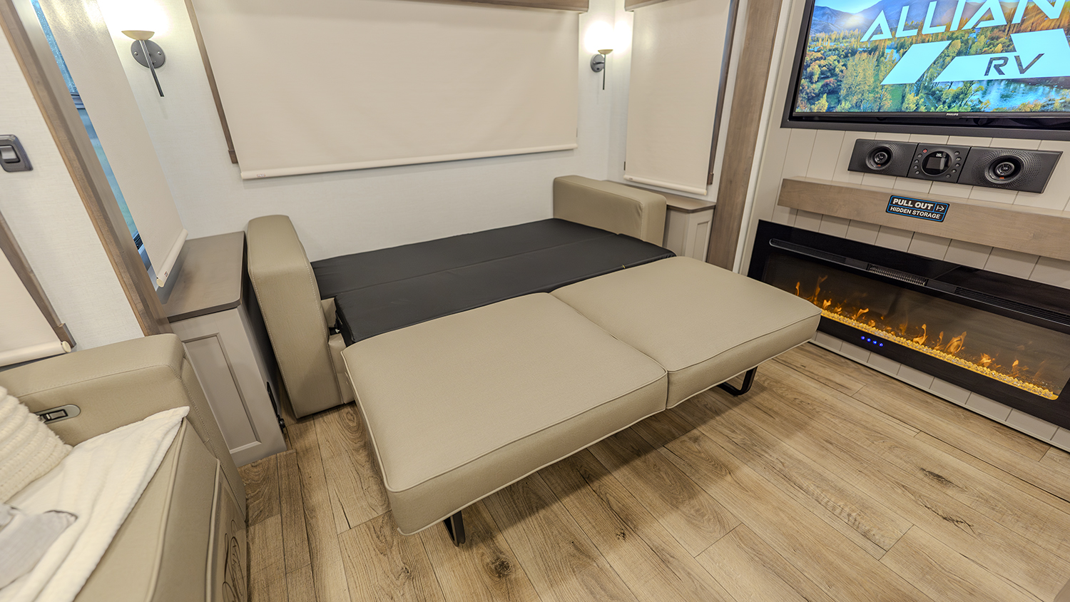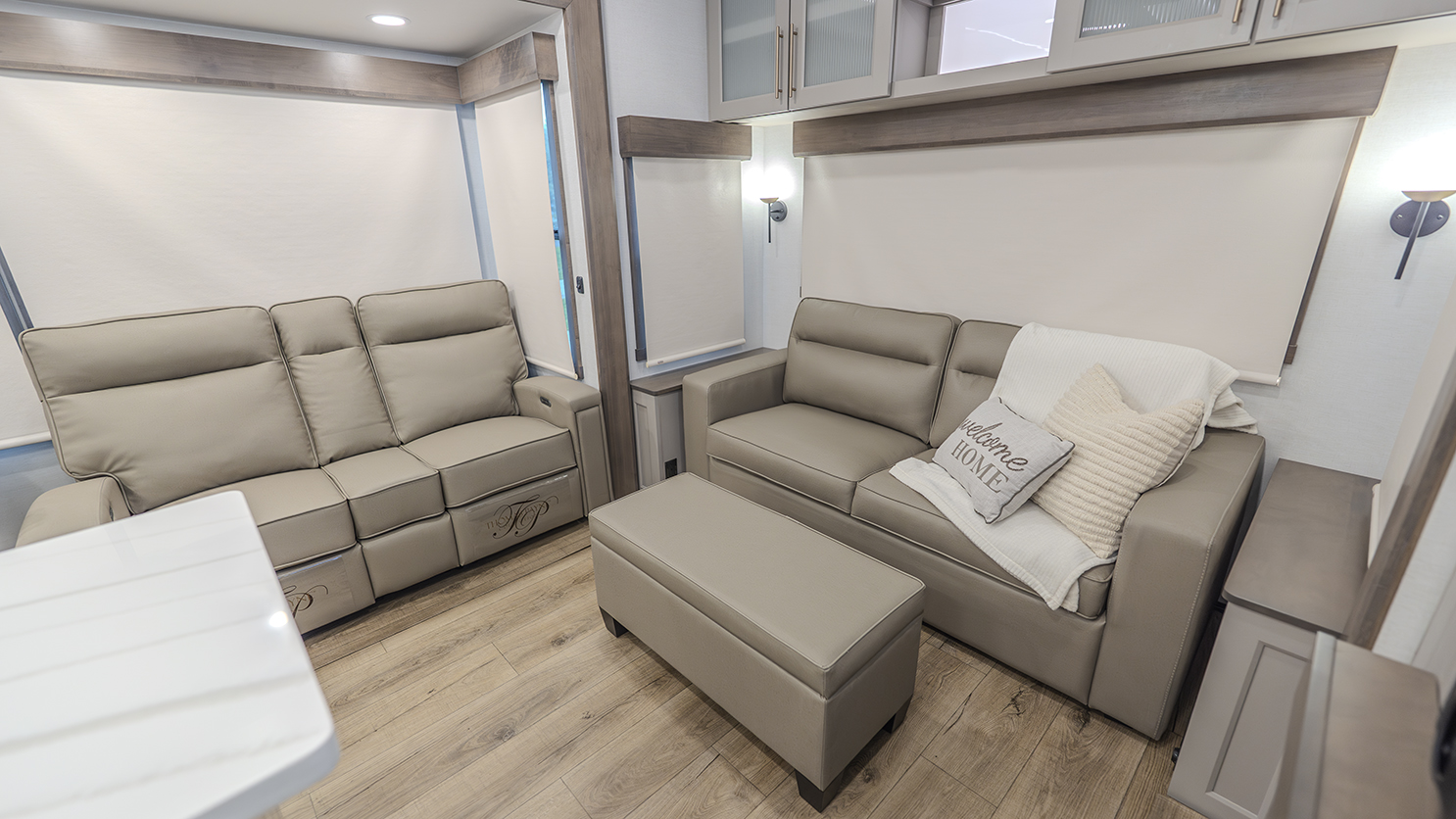 The main living and kitchen area is perfect for cooking, entertaining, and relaxing. It features residential appliances, including a kitchen island with dishwasher prep and a large sink. You’ll also find a pantry for snacks and hidden pantry storage behind the TV for extra convenience. The rear living area includes a dual recliner loveseat and a sleeper sofa along the back wall, offering plenty of seating for relaxation or socializing.
