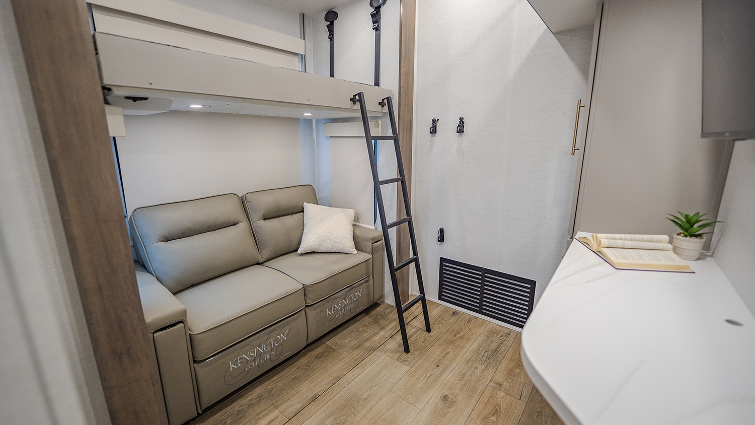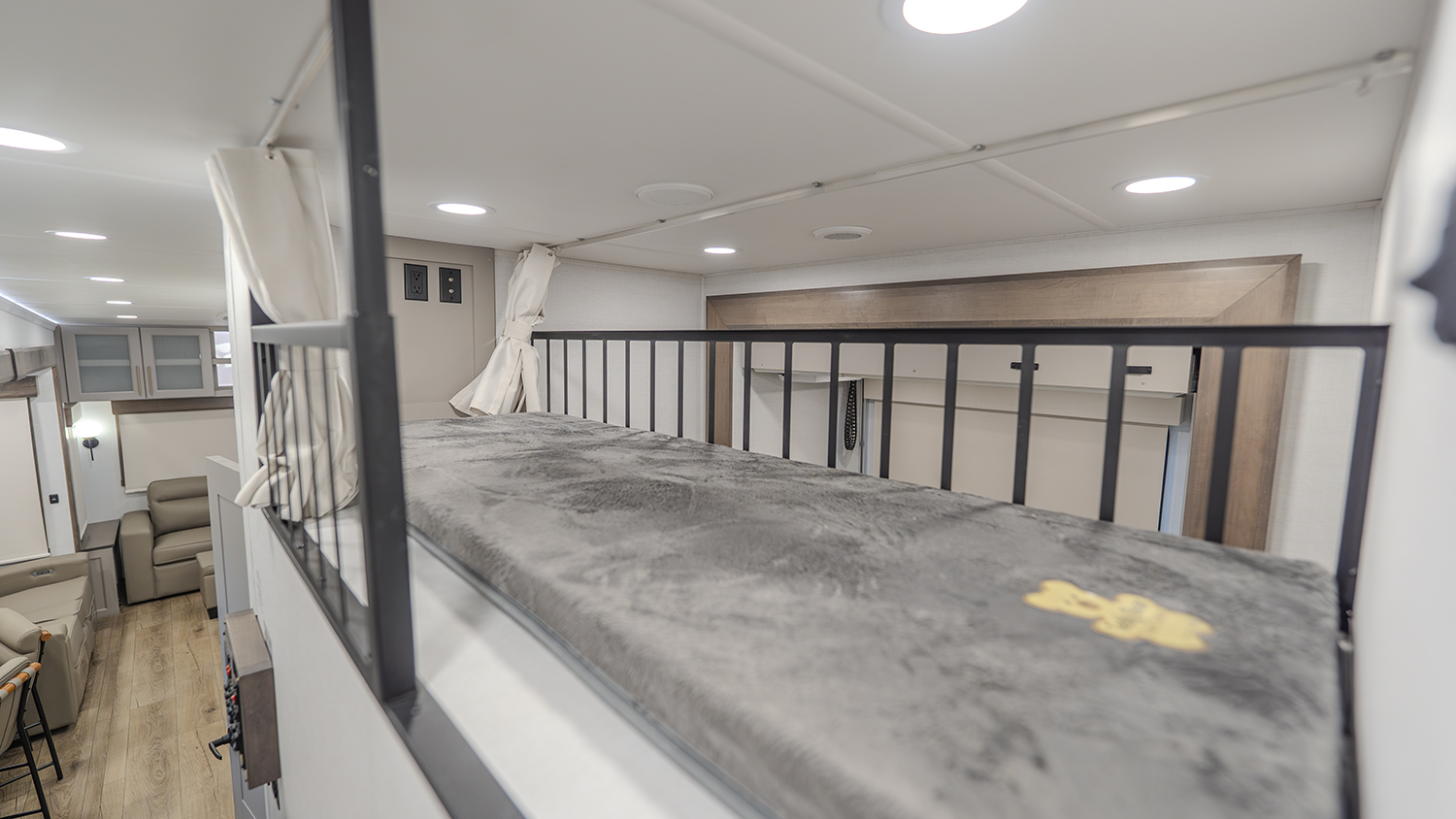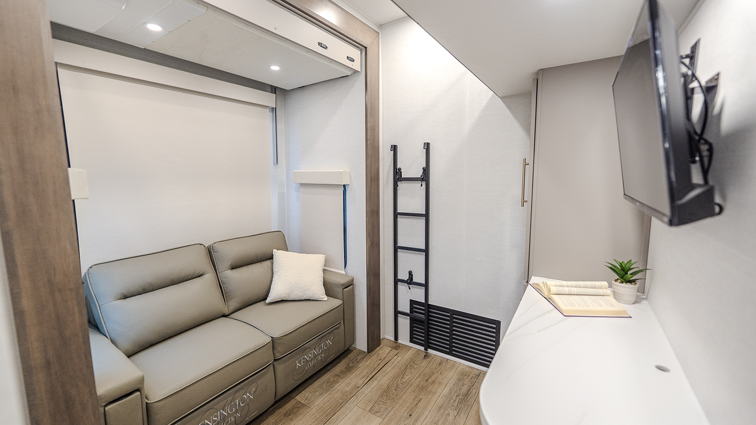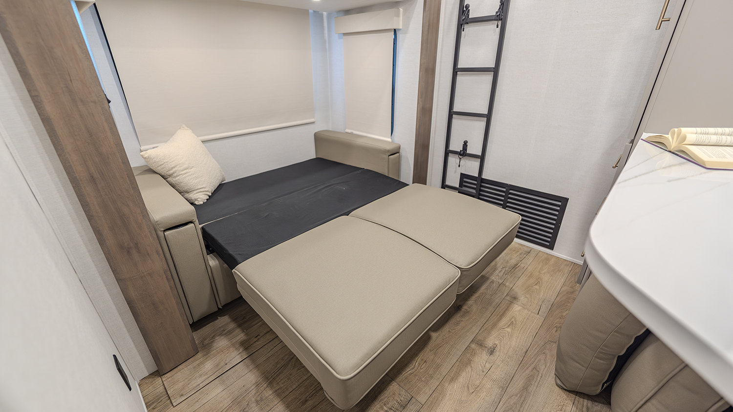 The main living and kitchen area is perfect for cooking, entertaining, and relaxing. It features residential appliances, including a kitchen island with dishwasher prep and a large sink. You’ll also find a pantry for snacks and hidden pantry storage behind the TV for extra convenience. The rear living area includes a dual recliner loveseat and a sleeper sofa along the back wall, offering plenty of seating for relaxation or socializing.