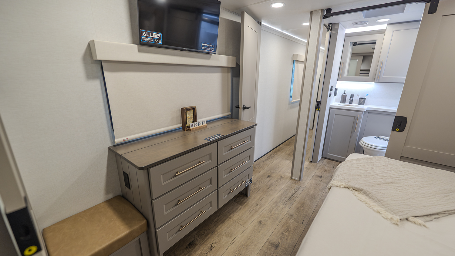The private master bedroom features a king bed slide-out (with an optional queen bed for more floor space), a large front wardrobe with washer and dryer prep, and a flip-top dresser with a Smart TV above. Double sliding doors lead into the full bathroom, which includes a spacious 48" x 30" shower, toilet, and vanity with sink, and can be accessed from both the hall and the bedroom.