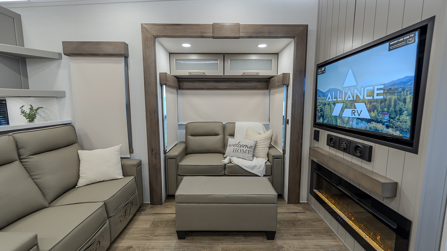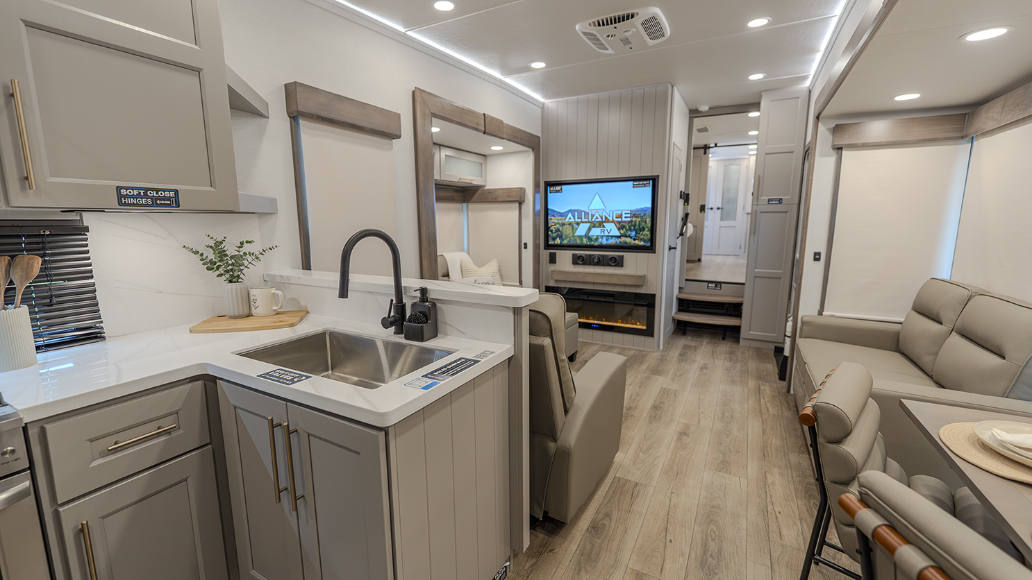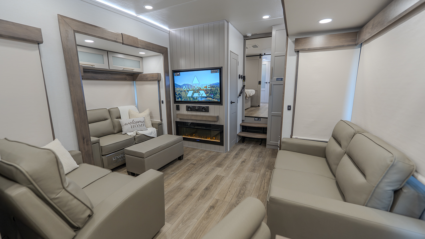 The Alliance RV Paradigm 382RK is the perfect blend of luxury, functionality, and comfort, designed for those who want to experience RV living at its finest. The rear kitchen is a chef’s dream, offering generous counter space, a 19 cu. ft. 12V residential refrigerator, and a pantry for all your snack and ingredient storage needs. With all the space and high-end appliances, meal prep will feel just like home.