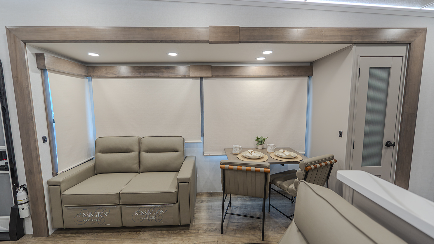The middle living area is ideal for relaxing or entertaining, featuring dual sleeper sofas and a dual recliner loveseat positioned across from the 50" Smart TV and fireplace. Whether you're winding down after a day of adventure or hosting guests, this space offers comfort and style. A half bathroom is conveniently located nearby for quick bathroom breaks, ensuring everyone stays comfortable throughout the day.
