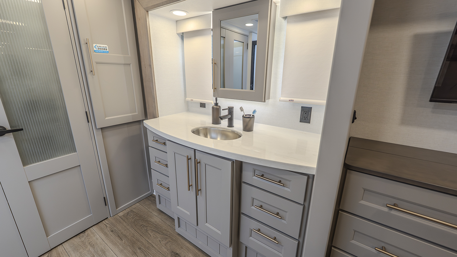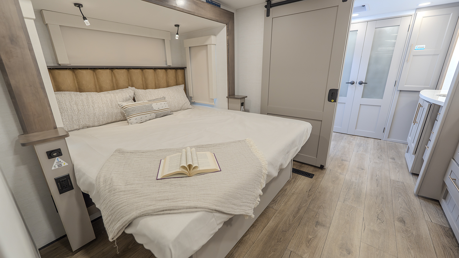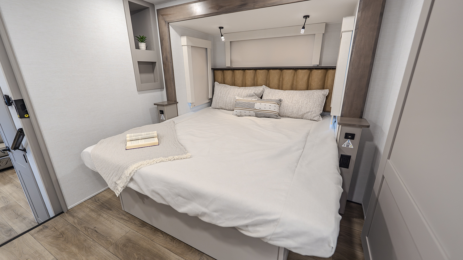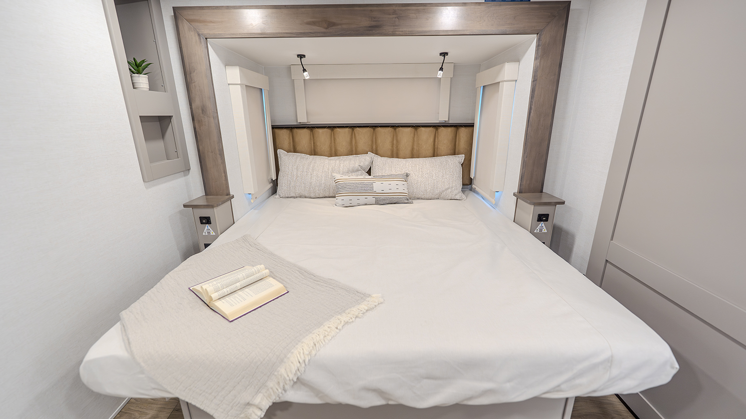 The master suite is a peaceful retreat with a king bed slide-out, offering plenty of room to stretch out and relax. Enjoy a cozy night in front of the flip-top dresser with a Smart TV mounted above, and make use of the convenient seat with storage for added organization. You’ll also have access to the front full bathroom, which features a 61" x 30" shower, a spacious walk-in closet with a hamper, shelves, and washer/dryer prep, so you can enjoy clean clothes no matter how far off the beaten path you travel.