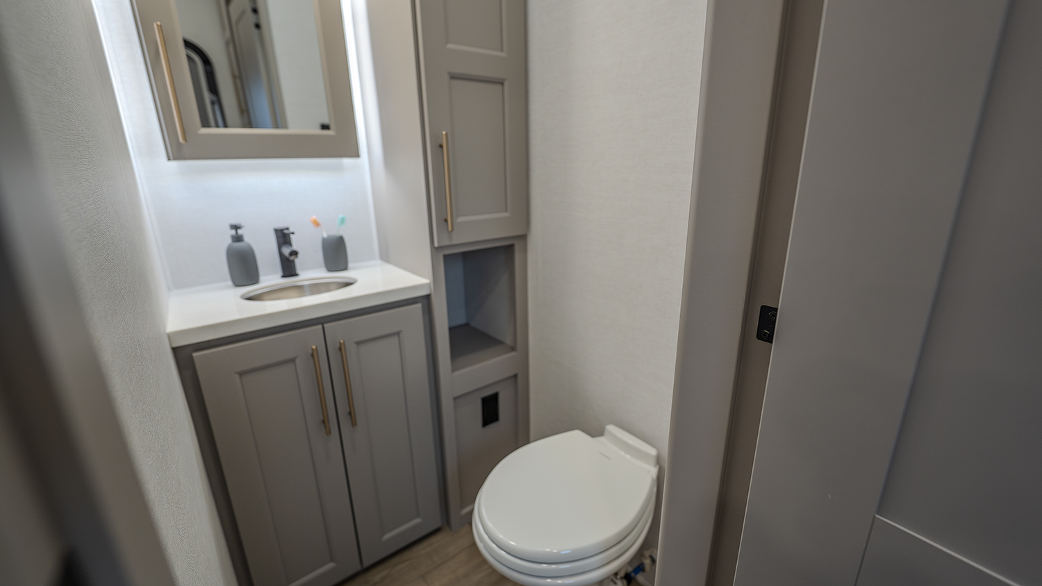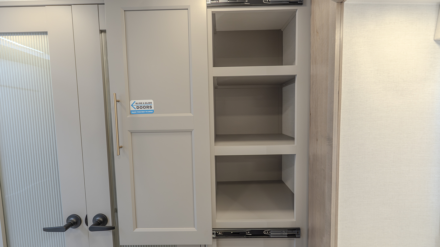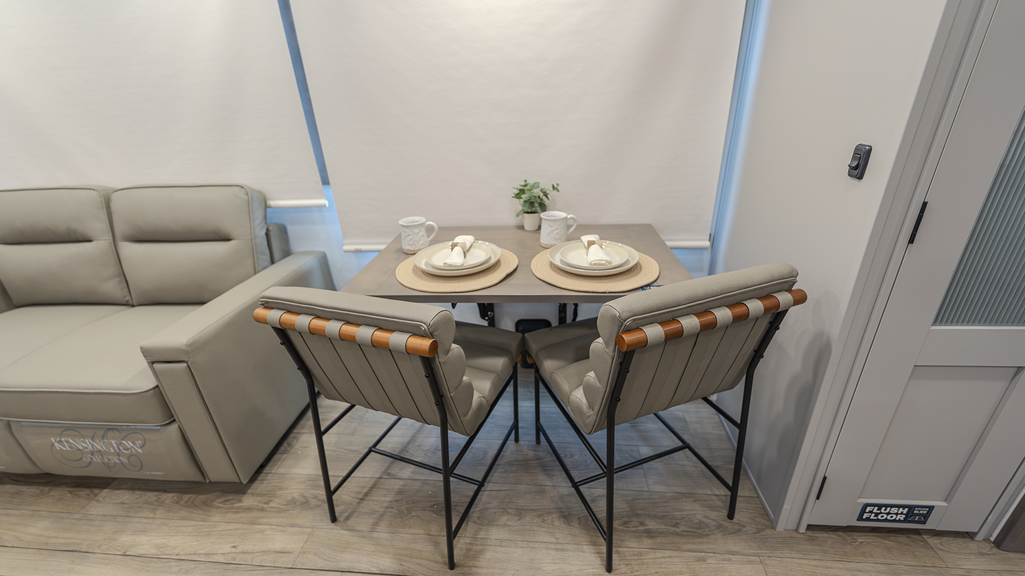The master suite is a peaceful retreat with a king bed slide-out, offering plenty of room to stretch out and relax. Enjoy a cozy night in front of the flip-top dresser with a Smart TV mounted above, and make use of the convenient seat with storage for added organization. You’ll also have access to the front full bathroom, which features a 61" x 30" shower, a spacious walk-in closet with a hamper, shelves, and washer/dryer prep, so you can enjoy clean clothes no matter how far off the beaten path you travel.
