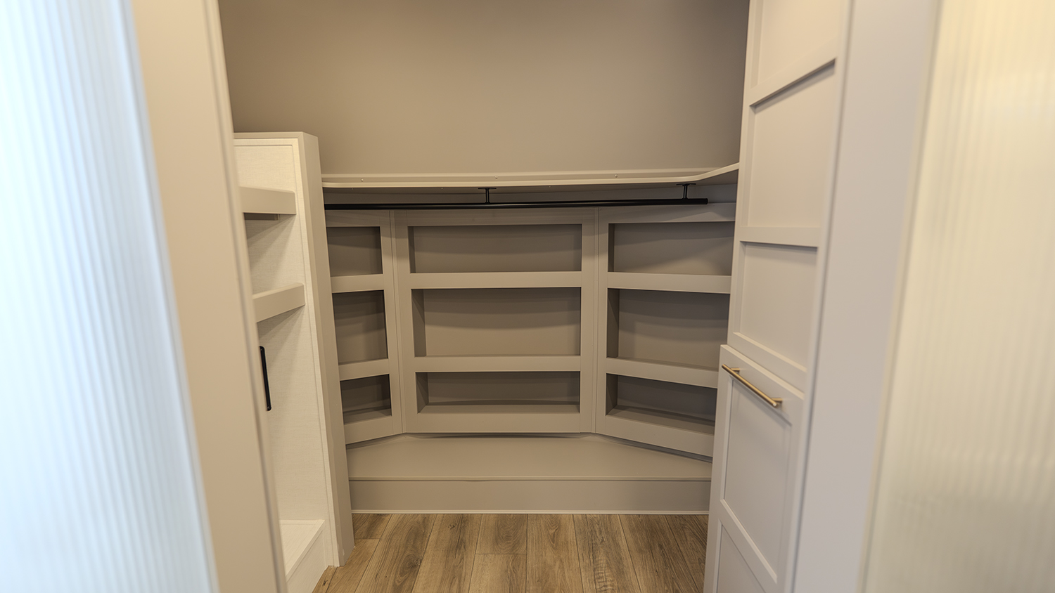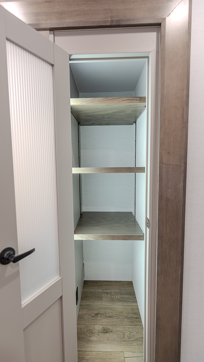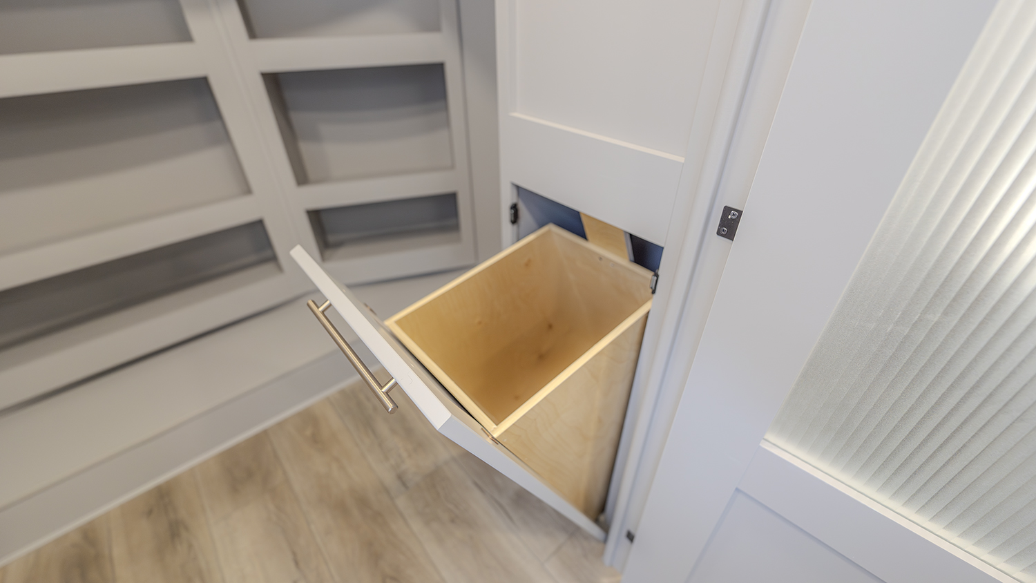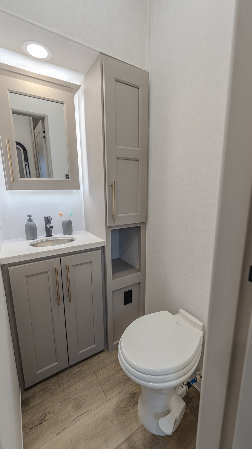 The master suite is a peaceful retreat with a king bed slide-out, offering plenty of room to stretch out and relax. Enjoy a cozy night in front of the flip-top dresser with a Smart TV mounted above, and make use of the convenient seat with storage for added organization. You’ll also have access to the front full bathroom, which features a 61" x 30" shower, a spacious walk-in closet with a hamper, shelves, and washer/dryer prep, so you can enjoy clean clothes no matter how far off the beaten path you travel.