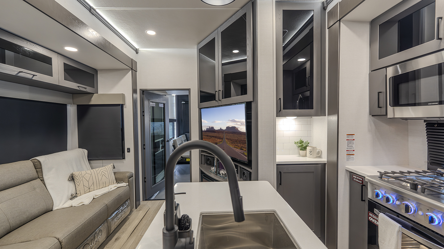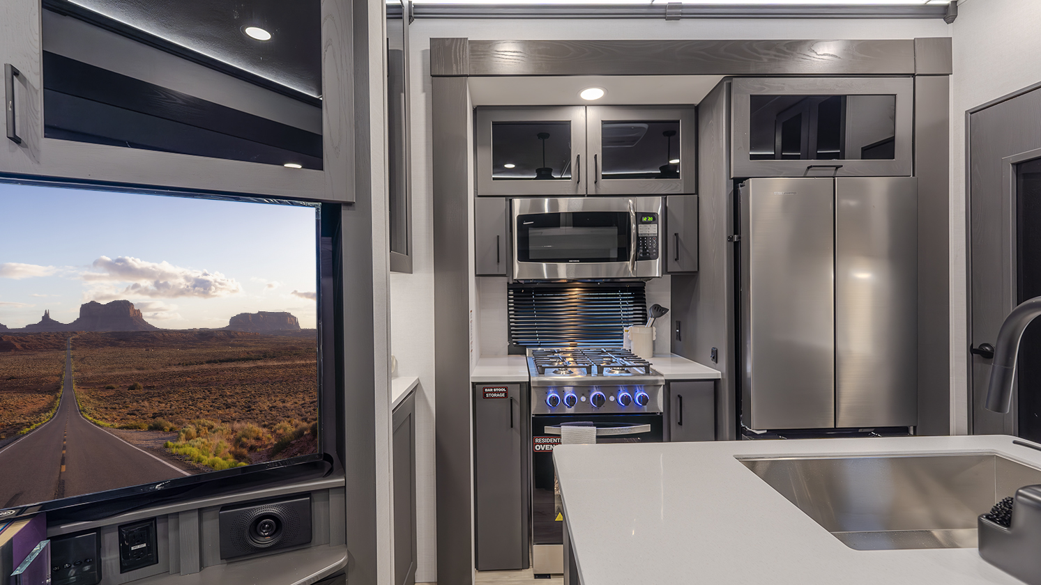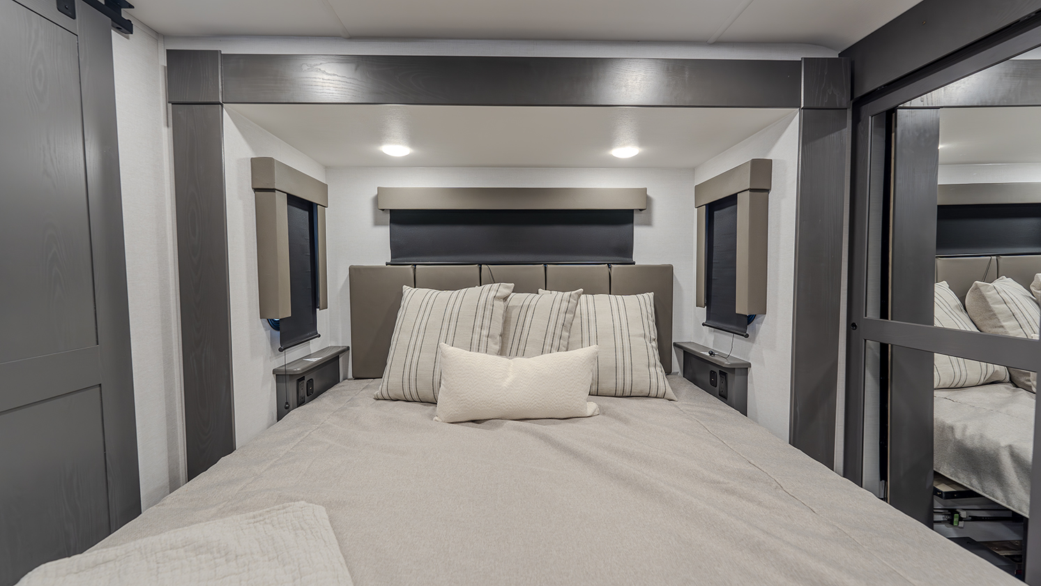 The kitchen is fully equipped to prepare your best meals with two hutches, three pantries, and a kitchen island with two bar stools for a casual dining experience. The dual-entry bathroom includes a 48" x 30" shower and provides direct access to the private front bedroom, ensuring your comfort and privacy. Inside the bedroom, the king bed slide-out gives you extra floor space, while a flip-top dresser and a large front wardrobe (prepped for an optional washer/dryer) provide ample storage.