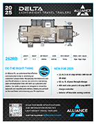 The Delta 262RB is a smartly designed travel trailer that delivers spacious comfort with thoughtful touches throughout. Its rear bath layout offers residential-style amenities with abundant counter space and storage, making daily routines feel effortless. In the main living area, a reclining loveseat and full dinette face a 40" HDTV and pantry-integrated entertainment center—perfect for relaxing after adventure-filled days. The well-equipped kitchen includes everything from a flip-up extension to a tip-out trash can and outdoor griddle grill, keeping meals both easy and enjoyable. With a private queen bedroom and generous storage inside and out, the 262RB offers upscale living in a tow-friendly footprint.
