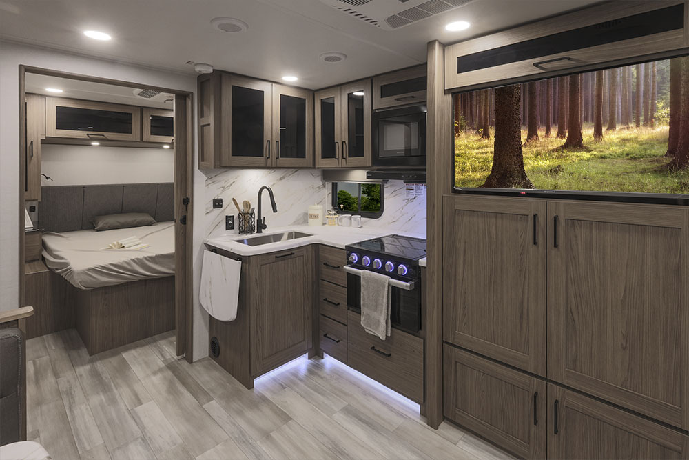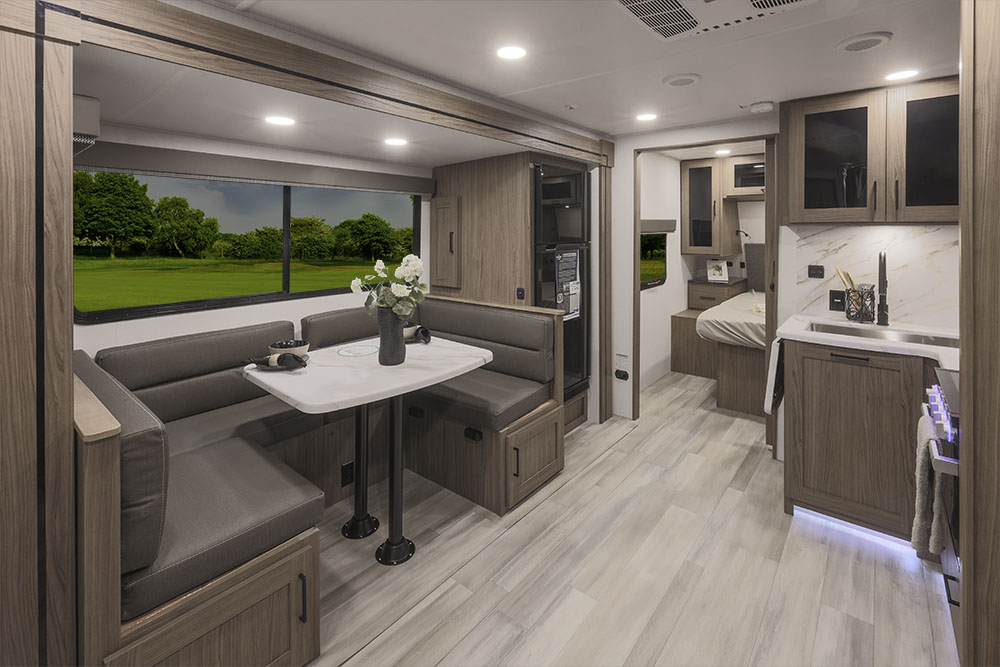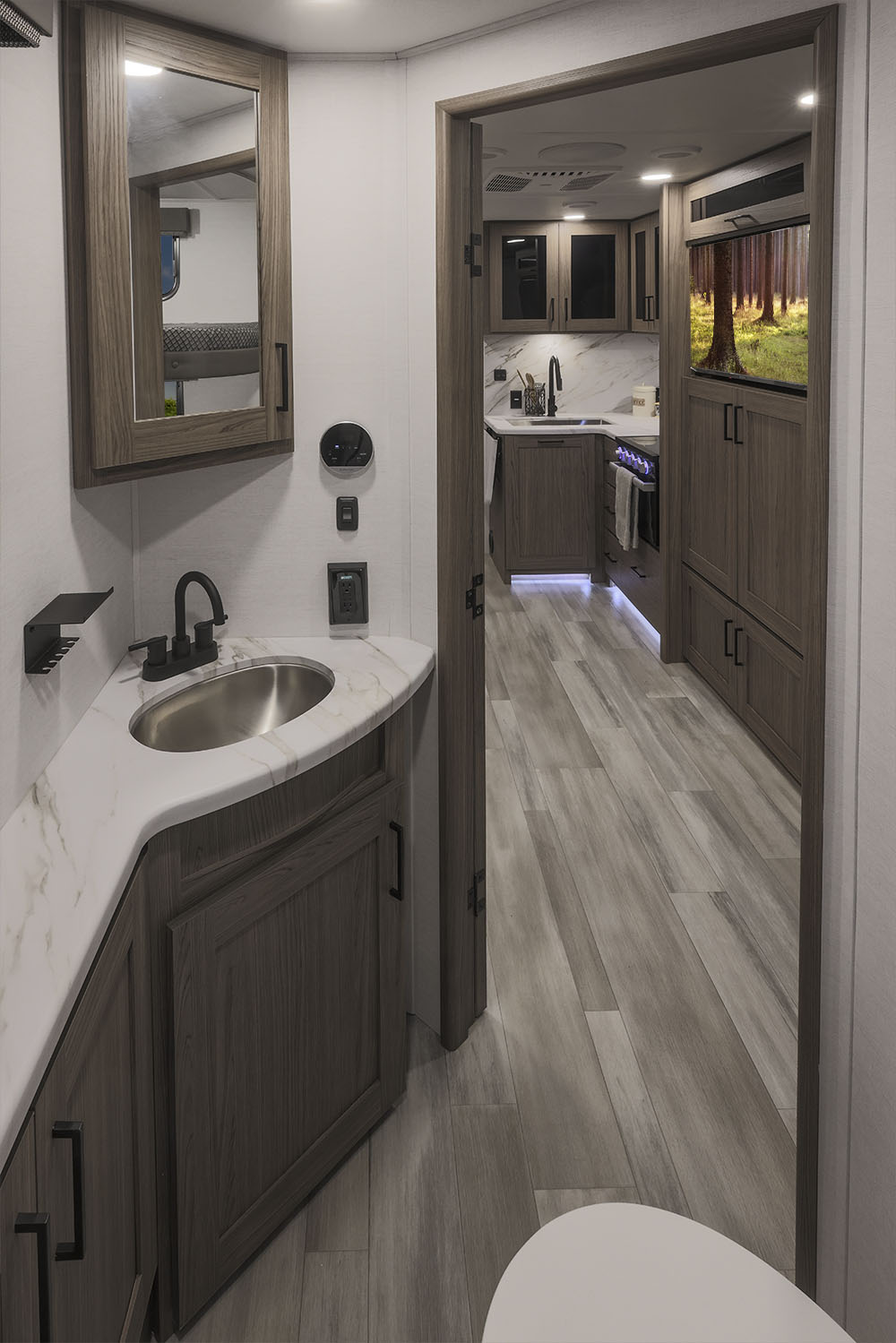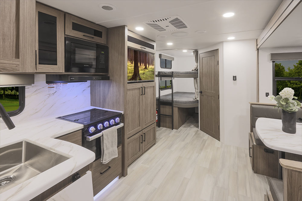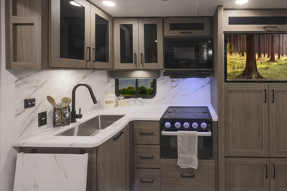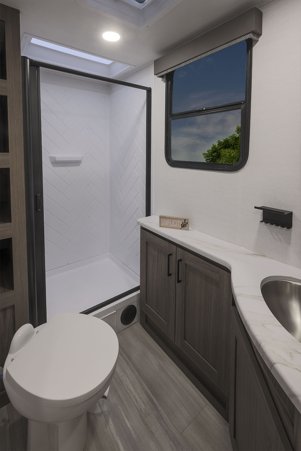 Inside, the kitchen has everything you need to prepare meals, including a three-burner range, 10 cu. ft. 12V refrigerator, and a large sink with a pull-out trash can for convenience. The rear corner bath features a 30" x 36" shower, vanity, and porcelain foot-flush toilet, providing comfort after a day of adventures.