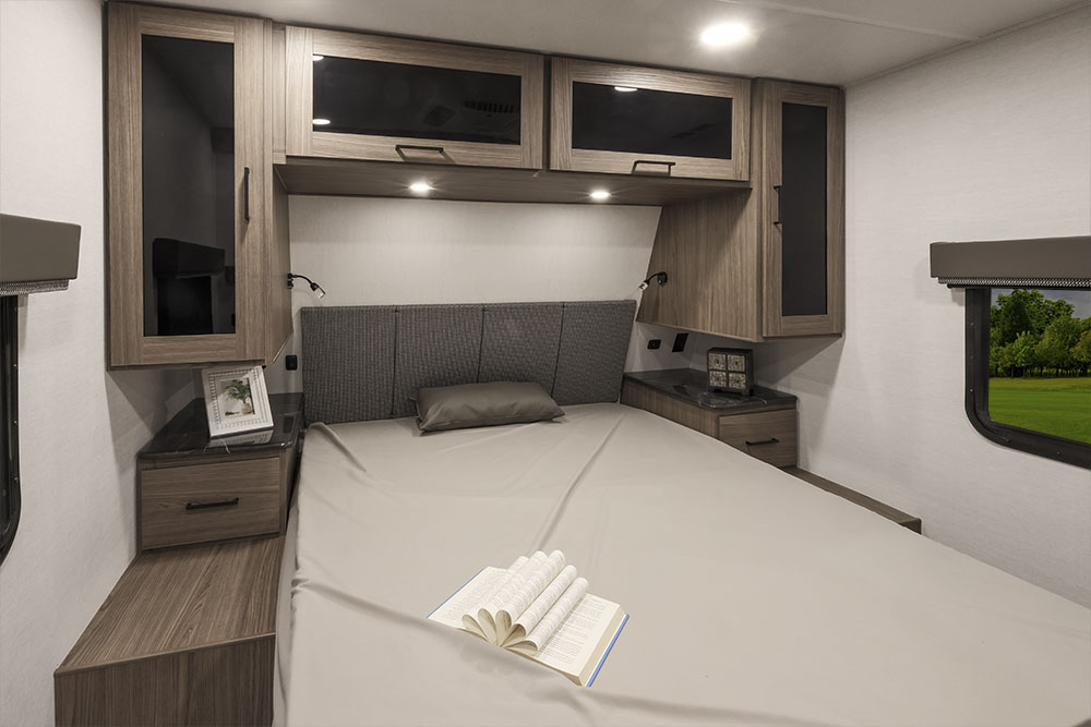 • The front private bedroom features a queen bed with overhead cabinets and bedside wardrobes for all your personal items. The U-shaped dinette offers flexible seating and easily converts to sleeping space for additional guests. For outdoor cooking, the outdoor griddle allows you to enjoy meals in nature.