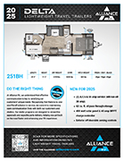 The Alliance RV Delta 251BH is designed for families and groups who love the great outdoors but don’t want to sacrifice comfort. With sleeping for up to eight people, this versatile travel trailer is perfect for your next adventure. Whether you’re enjoying time with family or friends, the Delta 251BH offers the space and amenities you need to make your camping experience memorable.
