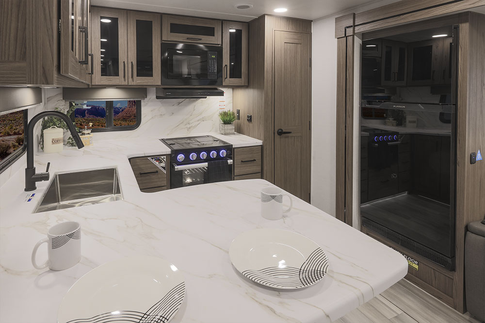 Alliance RV Delta 294RK Travel Trailer, a luxury travel trailer designed to combine comfort, style. Whether you're relaxing indoors, cooking up meals, or enjoying the great outdoors, this trailer is packed with features that make every moment memorable. The rear kitchen is a highlight, equipped with a three-burner cooktop, a 10 cu. ft. 12V refrigerator, and a tip-out trash can for convenience. The kitchen also includes two bar stools for a relaxed dining experience, giving you the space to enjoy meals with ease. For those who love to cook outdoors, the Delta 294RK also comes with an outdoor griddle, allowing you to prepare meals outside. When it's time to enjoy the outdoors, the Delta 294RK has you covered with two awnings and a 32" TV. , this trailer ensures your outdoor living space is just as comfortable as the interior. Inside, the private bedroom, queen bed, wardrobe, and nightstands. The spacious living area features a cozy fireplace and a 50" HDTV, providing the perfect spot to unwind after a day of outdoor fun.