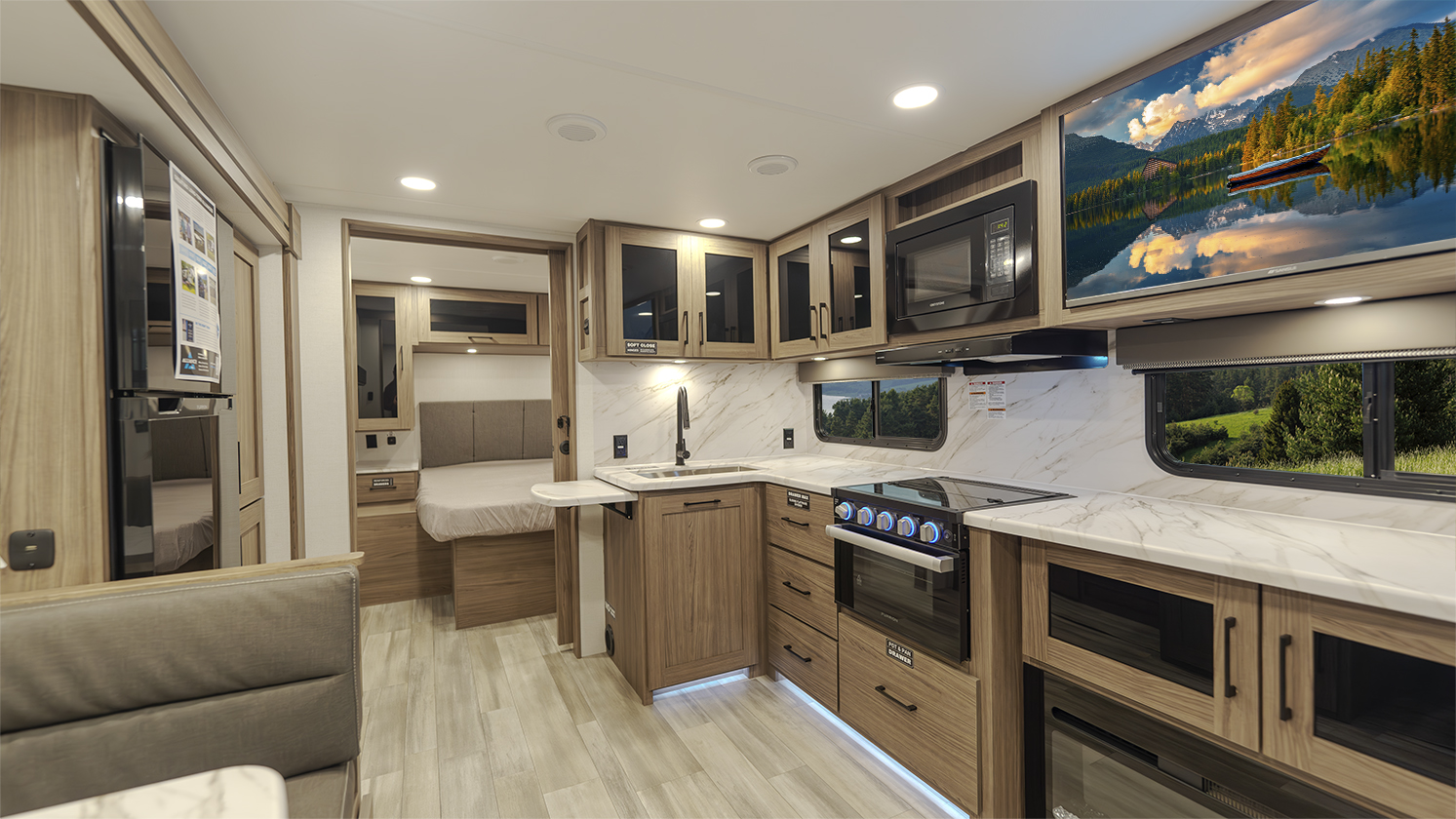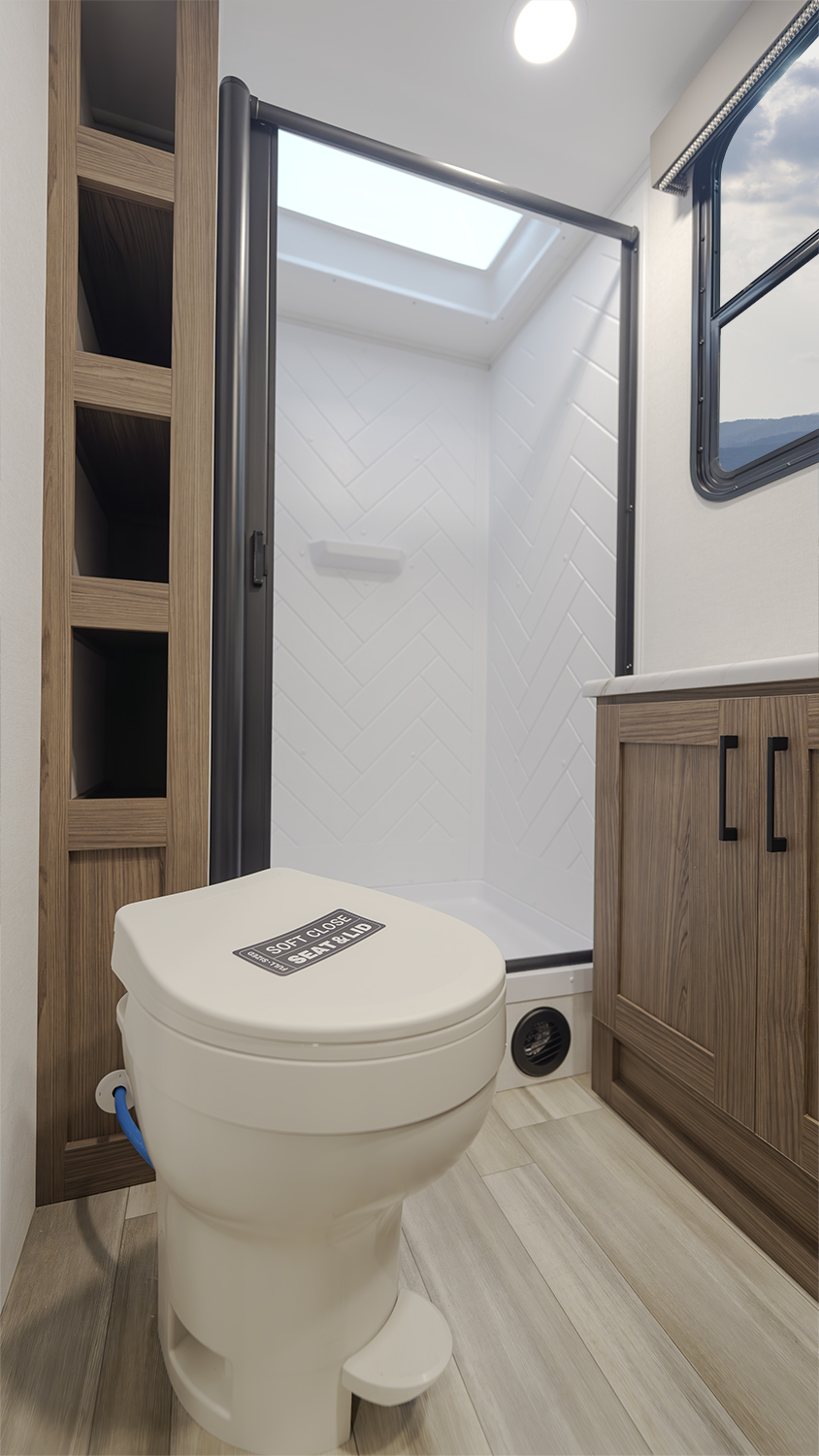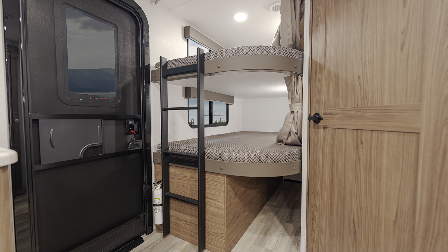The Alliance RV Delta Ultra Lite travel trailer BH241 is a couple's trailer perfect for weekend trips. It includes a theater seat slide, fireplace, three burner cooktop, and front queen bed. The full bath has a toilet, sink, 32" shower, and linen closet. Storage with dual wardrobes, nightstands, and overhead storage. The Delta Ultra Lite BH241 is a family-friendly travel trailer designed for comfort and lightweight convenience. It is 29 feet 5 inches long and weighs 5,800 pounds, perfect for family adventures.19-foot awning, booth dinette, ample storage, bedroom, and rear bunkhouse. The exterior features of the Delta Ultra Lite travel trailer include oversized atrium windows, a carpet-free interior, magnet catches on cabinets, soft close cabinet doors, LED lighting, temperature-controlled spray ports, exterior awning controls, a 2" rear accessory hitch, and Goodyear Endurance tires.