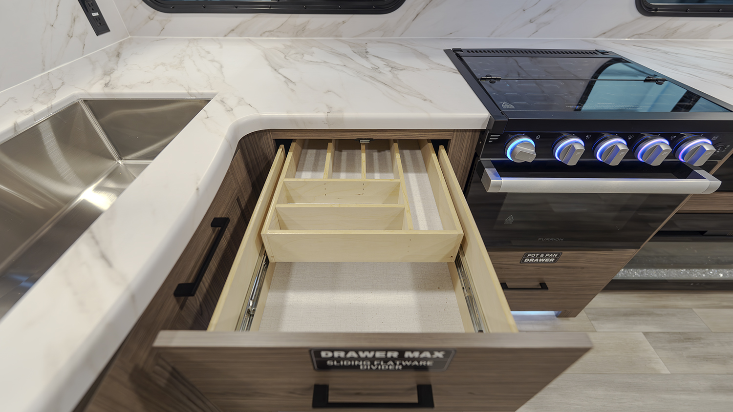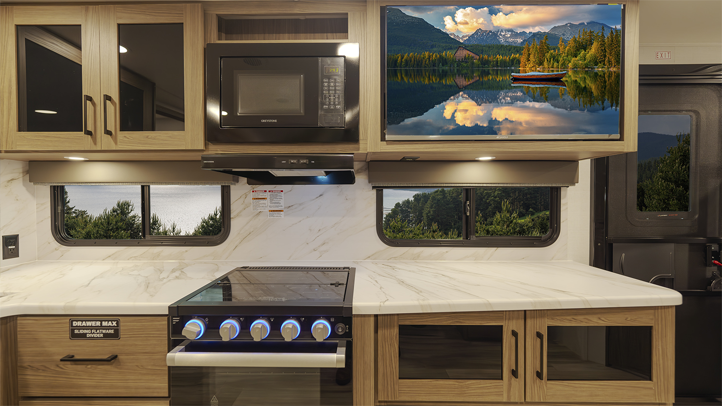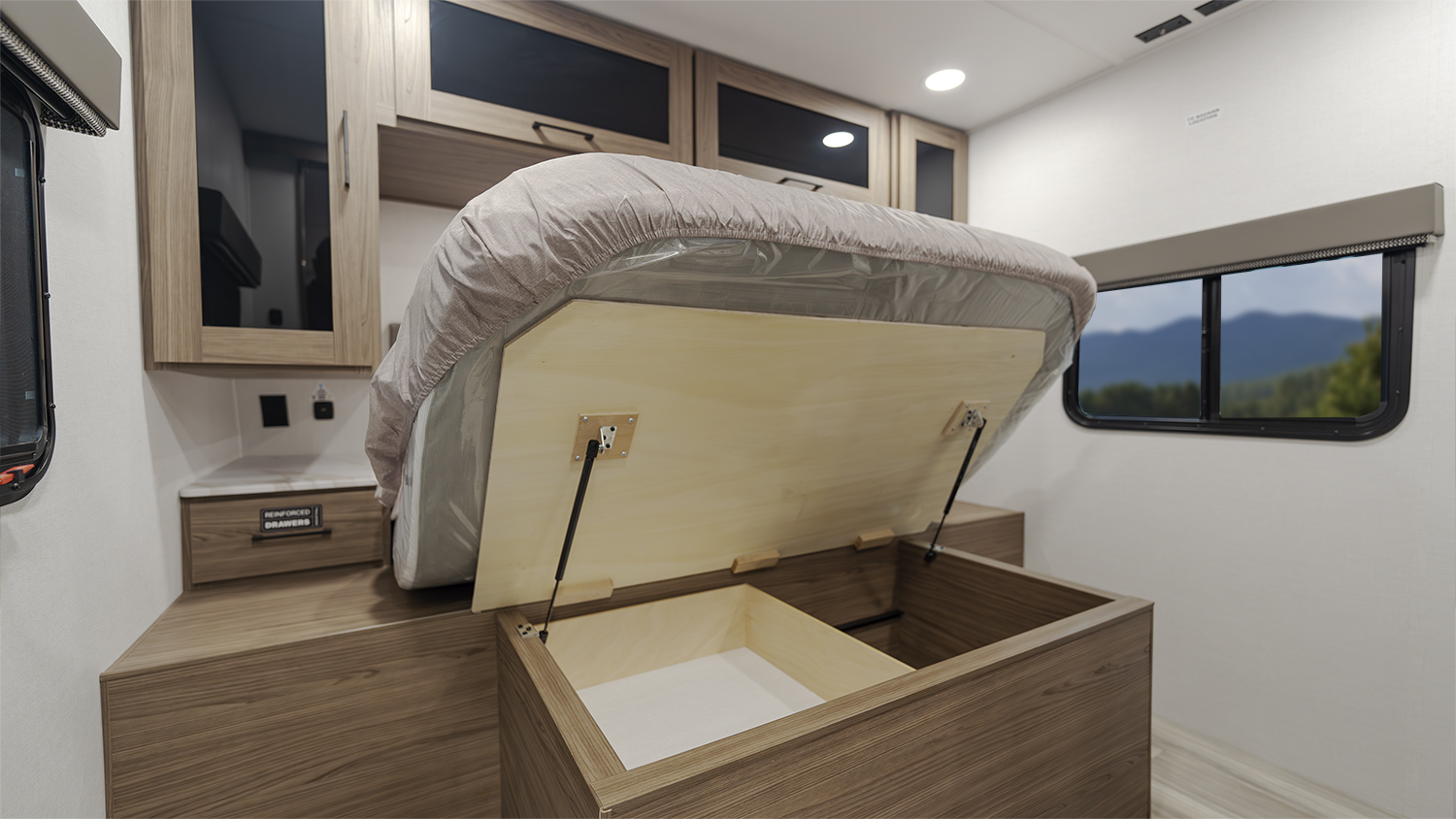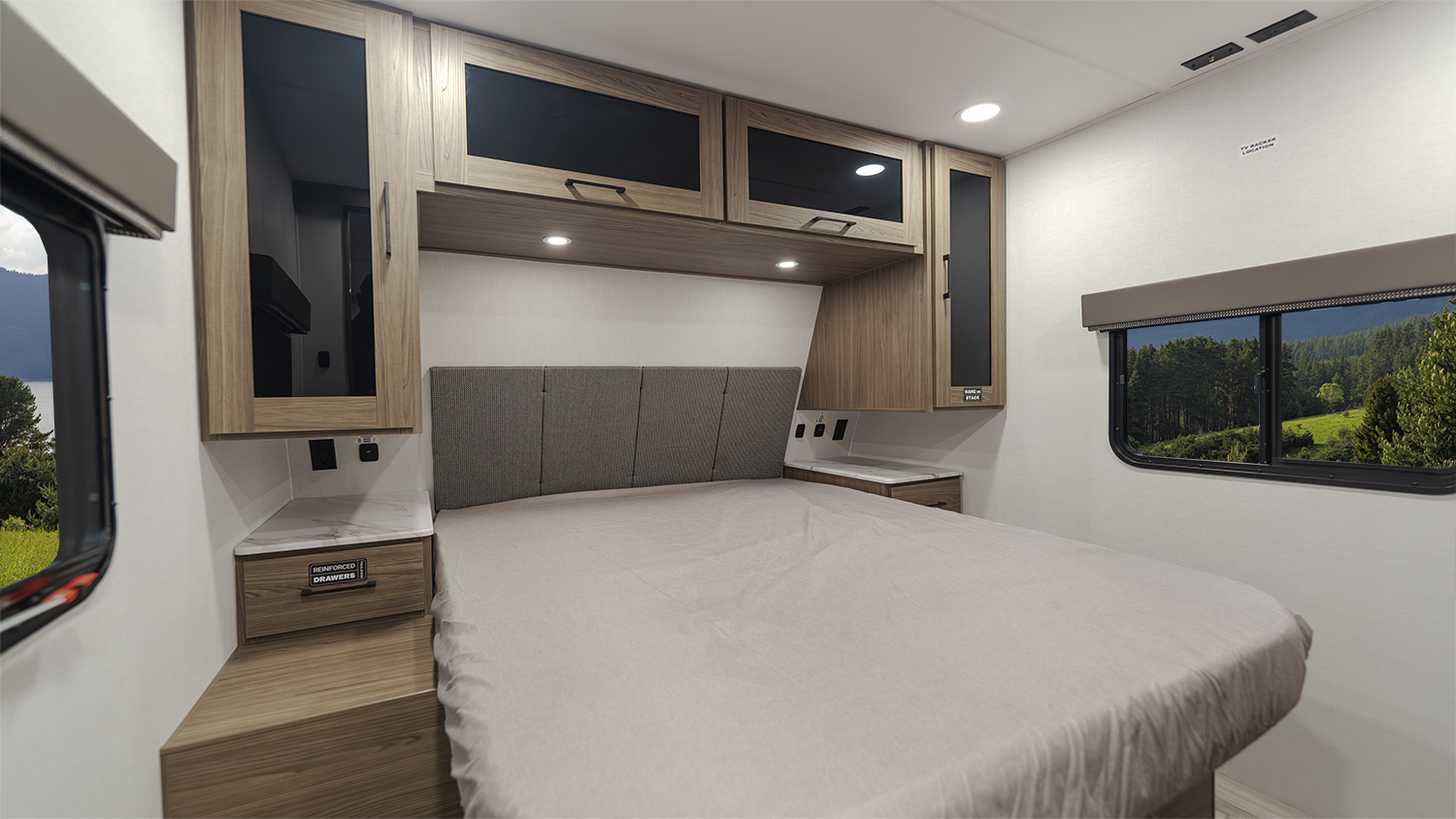 The Alliance RV Delta Ultra Lite travel trailer BH241 is a couple's trailer perfect for weekend trips. It includes a theater seat slide, fireplace, three burner cooktop, and front queen bed. The full bath has a toilet, sink, 32" shower, and linen closet. Storage with dual wardrobes, nightstands, and overhead storage. The Delta Ultra Lite BH241 is a family-friendly travel trailer designed for comfort and lightweight convenience. It is 29 feet 5 inches long and weighs 5,800 pounds, perfect for family adventures.19-foot awning, booth dinette, ample storage, bedroom, and rear bunkhouse. The exterior features of the Delta Ultra Lite travel trailer include oversized atrium windows, a carpet-free interior, magnet catches on cabinets, soft close cabinet doors, LED lighting, temperature-controlled spray ports, exterior awning controls, a 2" rear accessory hitch, and Goodyear Endurance tires.