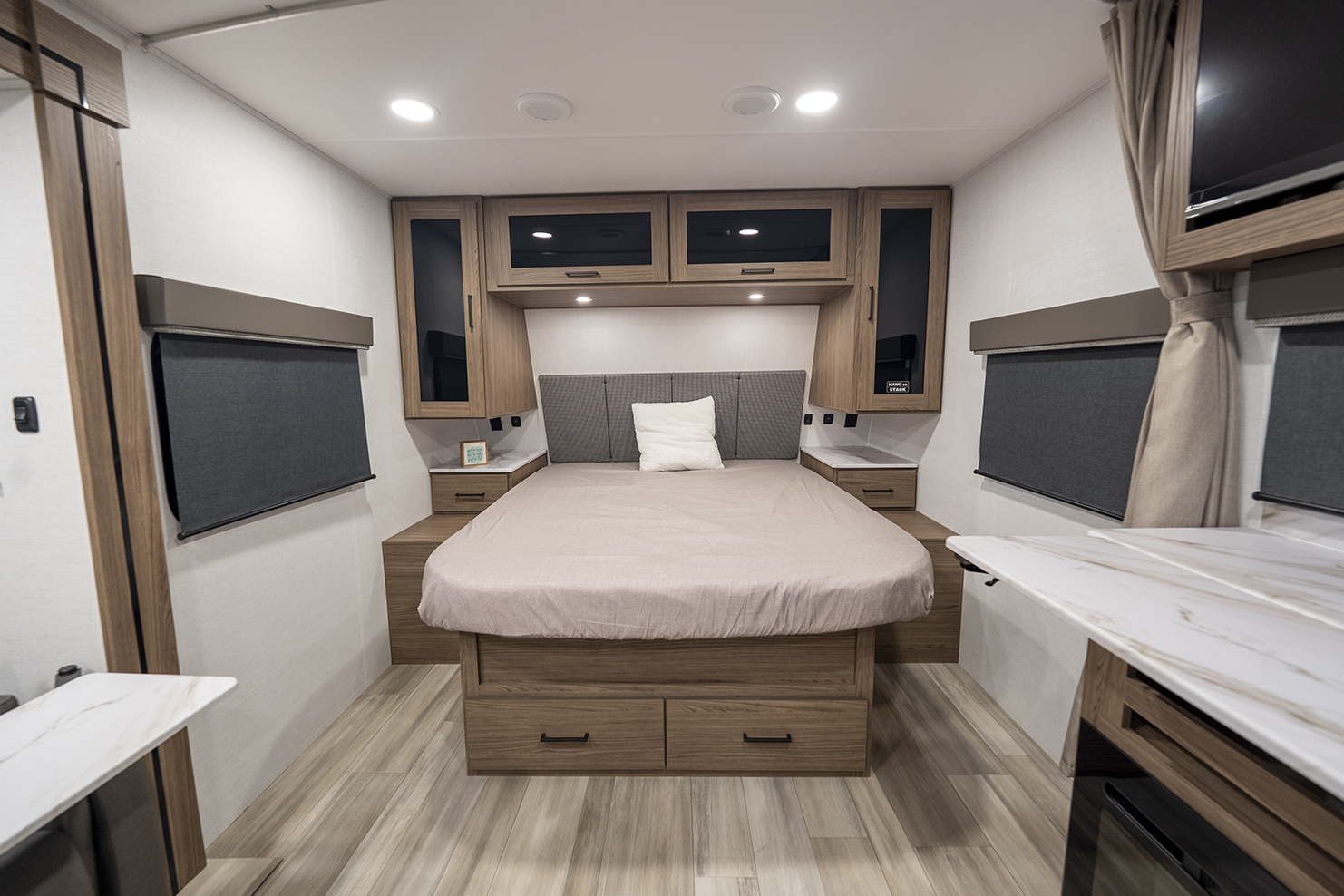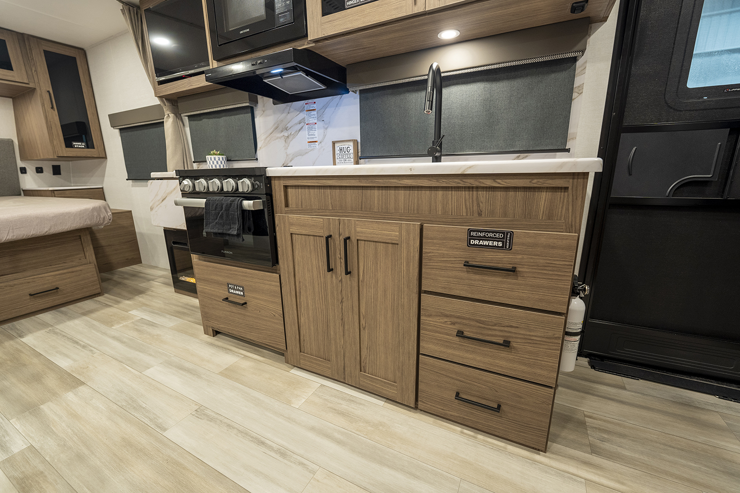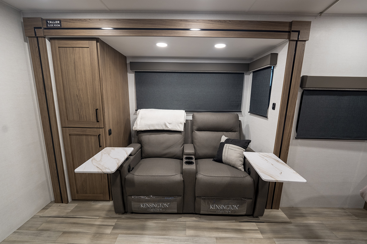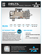 The Alliance RV Delta Ultra Lite travel trailer ML206 is a couple's perfect weekend getaway option with a front queen bed, full bath, and entryway closet for convenience. The theater seat slide and fireplace provide comfort. The kitchen features a pantry, three-burner cooktop, and large sink for easy meal prep and cleanup. The full bath includes a toilet, sink, shower, and linen closet. Storage options include dual wardrobes, nightstands, and overhead storage. Delta Ultra Lite trailers are lightweight with oversized atrium windows, carpet-free interiors, and modern features like magnet catches, soft close doors, and LED accent lighting. Exterior features include pass-through storage, multiple spray ports, awning controls, and Goodyear Endurance tires for a seamless outdoor experience. Start your adventure today with a Delta Ultra Lite travel trailer!