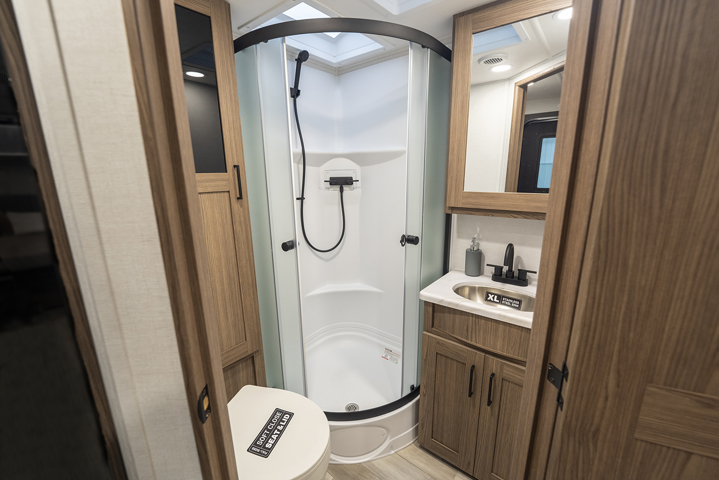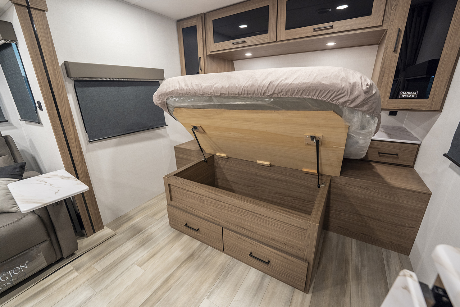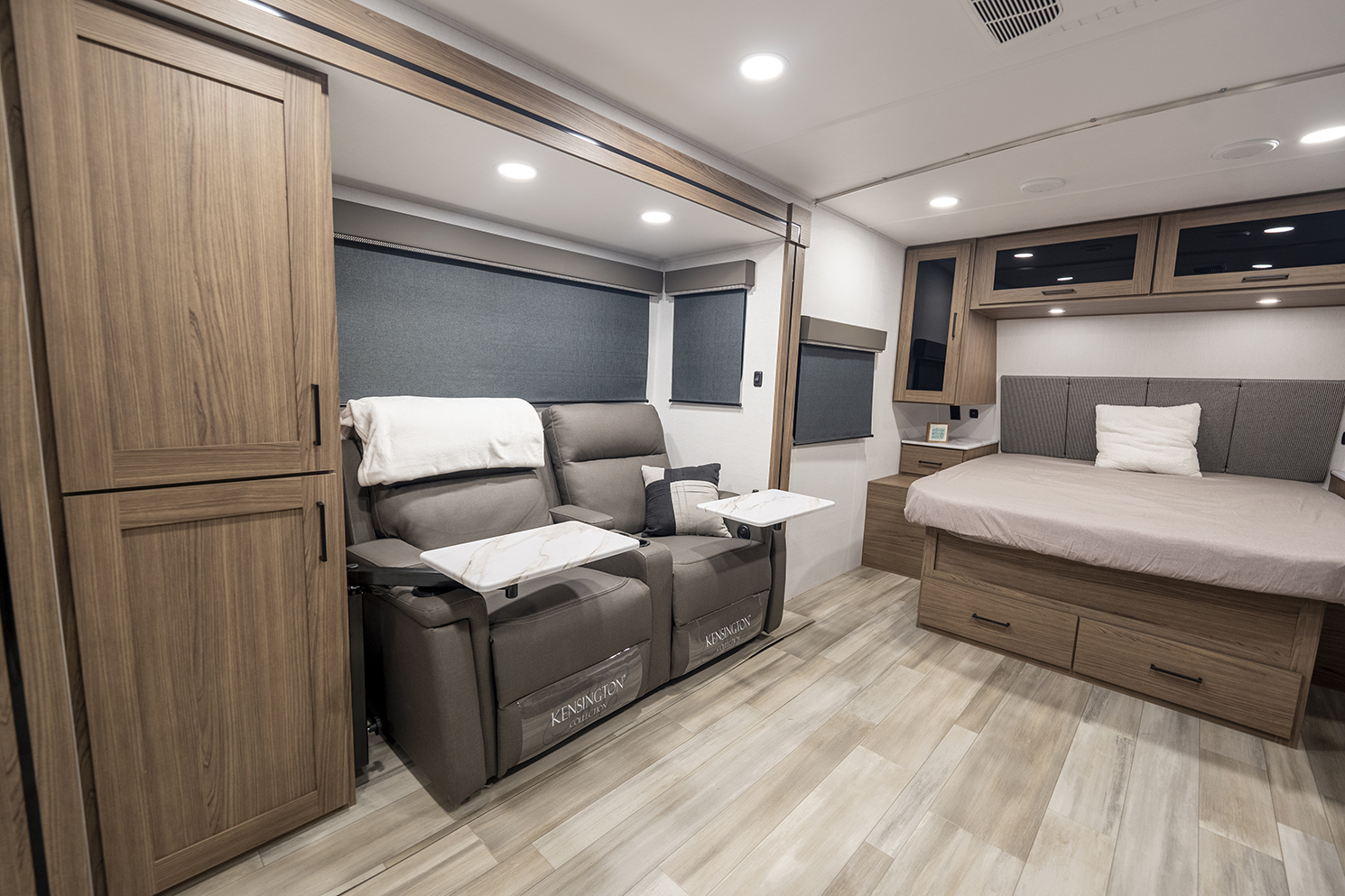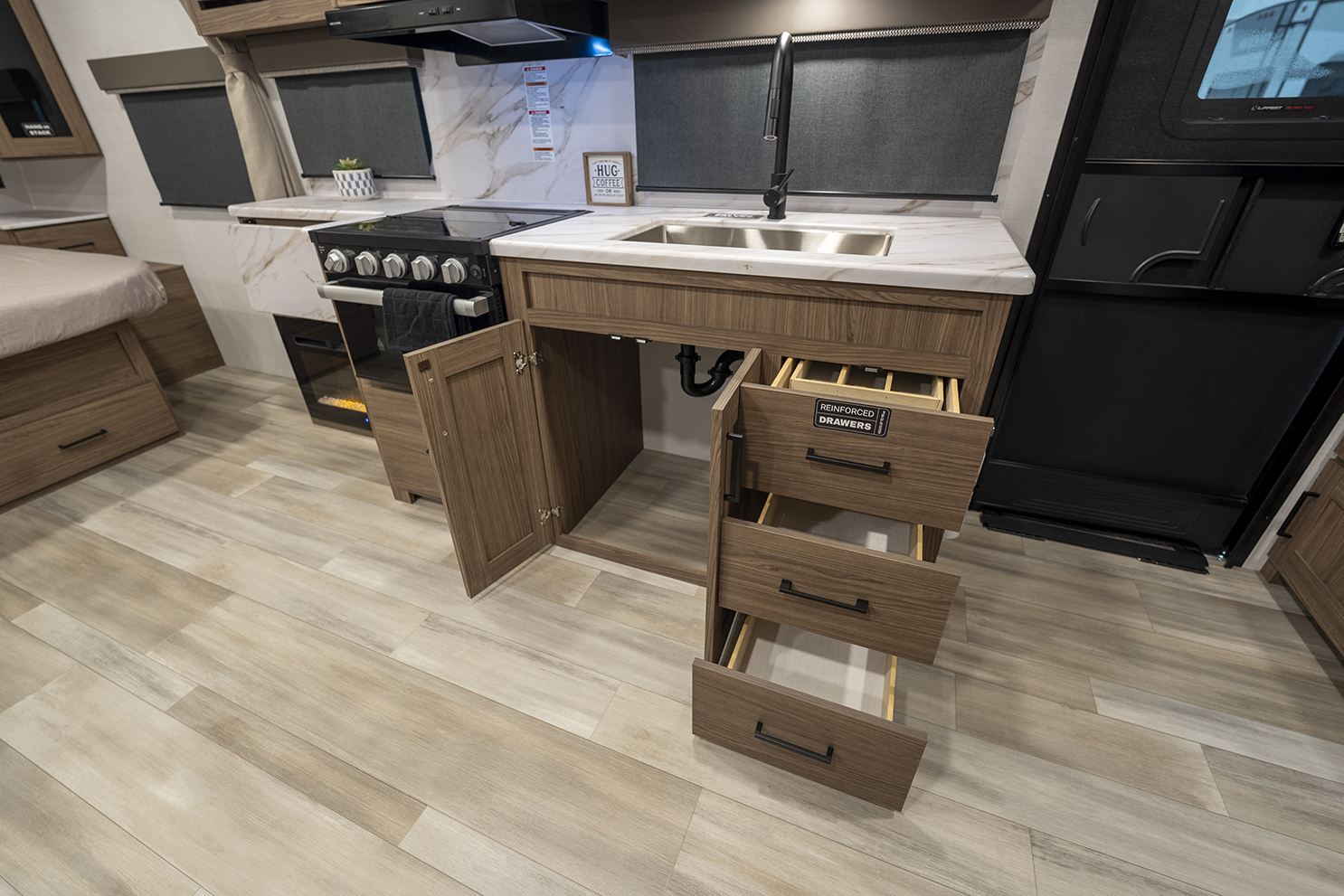The Alliance RV Delta Ultra Lite travel trailer ML206 is a couple's perfect weekend getaway option with a front queen bed, full bath, and entryway closet for convenience. The theater seat slide and fireplace provide comfort. The kitchen features a pantry, three-burner cooktop, and large sink for easy meal prep and cleanup. The full bath includes a toilet, sink, shower, and linen closet. Storage options include dual wardrobes, nightstands, and overhead storage. Delta Ultra Lite trailers are lightweight with oversized atrium windows, carpet-free interiors, and modern features like magnet catches, soft close doors, and LED accent lighting. Exterior features include pass-through storage, multiple spray ports, awning controls, and Goodyear Endurance tires for a seamless outdoor experience. Start your adventure today with a Delta Ultra Lite travel trailer!
