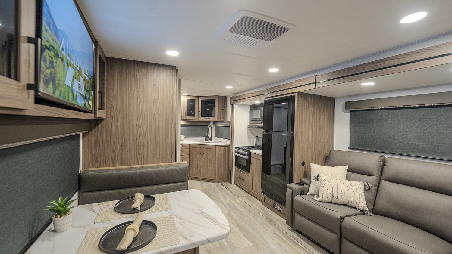 - Smart Open Layout: A spacious living area with a plush theater sofa and a versatile dinette for meals, work, or relaxation.