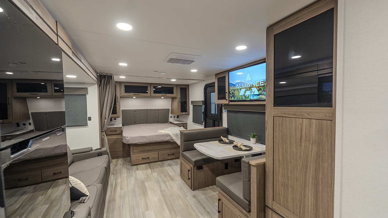 - Private Bedroom Retreat: Enjoy a 60" x 80" queen bed with wardrobe nightstands, overhead storage, and a privacy curtain for added comfort.