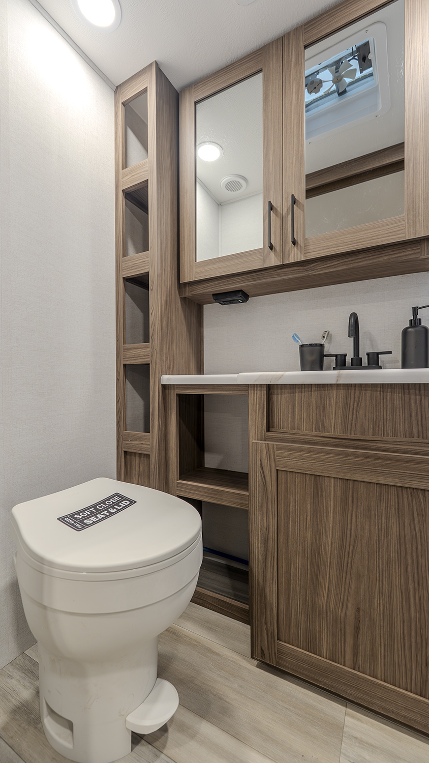 - Functional Kitchen: Equipped with a 10 cu. ft. 12-volt refrigerator, a pull-out pantry, and ample overhead storage for all your cooking essentials.