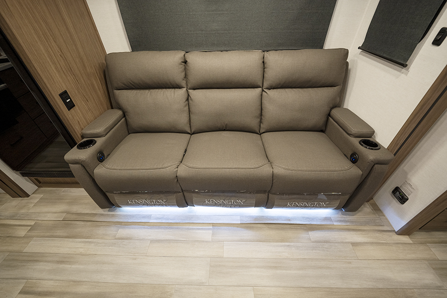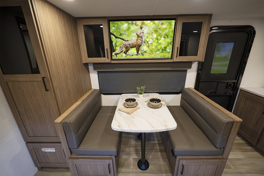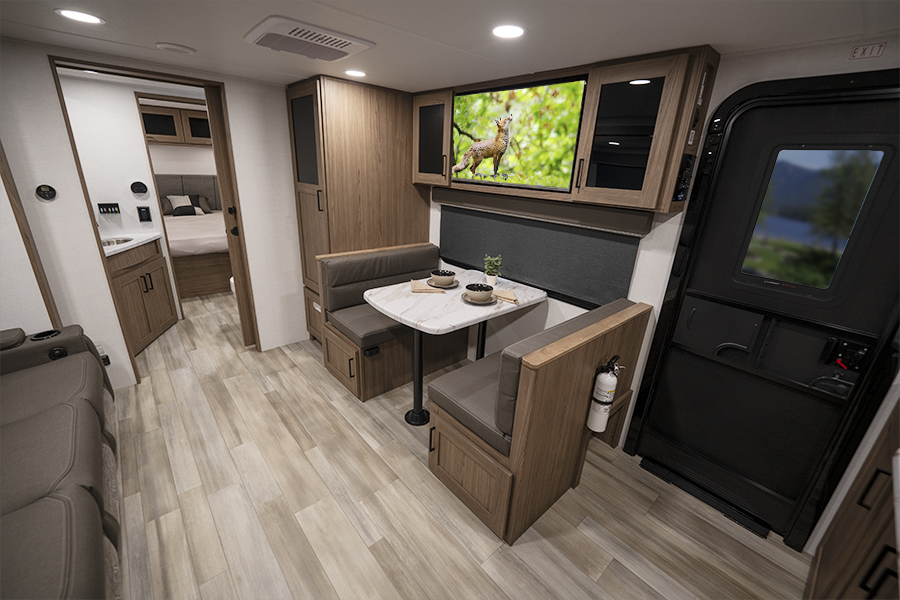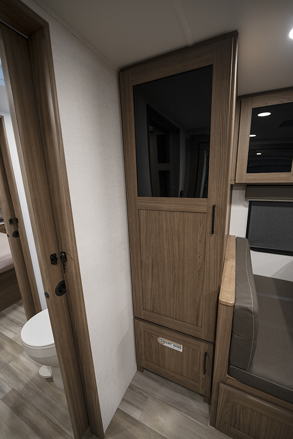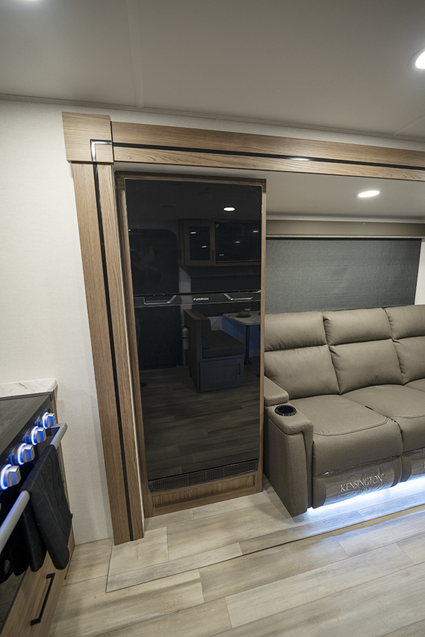 - Rear Kitchen Design: The thoughtfully designed rear kitchen includes upper cabinets for ample storage, a three-burner cooktop, and a large pantry to keep your essentials organized. The 10 cu. ft. 12-volt refrigerator ensures plenty of space to store fresh food during your travels.
