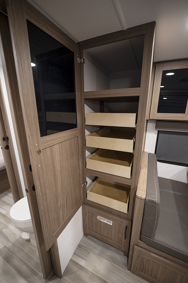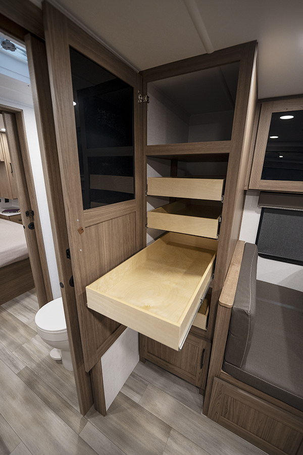 - Bedroom Retreat: At the front, you'll find a queen-size bed (60" x 80") with hidden storage underneath, perfect for blankets or extra gear. Nightstands on both sides and upper storage provide space for your clothing and personal items.
